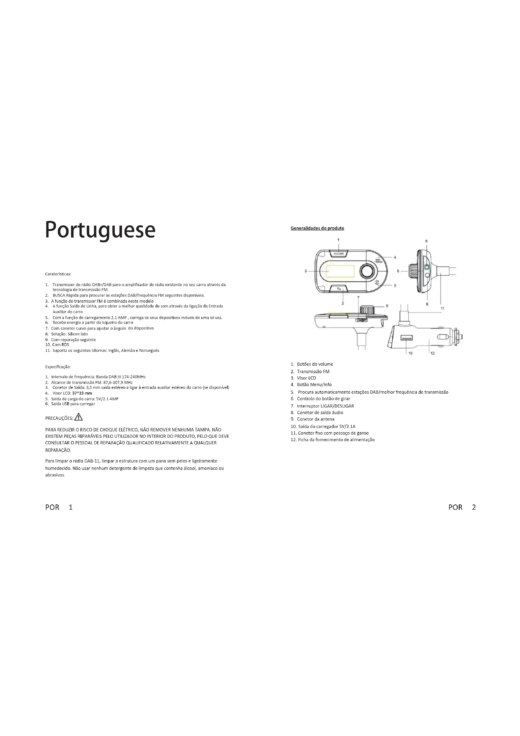 PARÁVEIS PELO UTILIZADOR NO INTERIOR DO PRODUTO, PELO QUE DEVE CONSULTAR O PESSOAL DE REPARAÇÃO QUALIFICADO RELATIVAMENTE A QUALQUER REPARAÇÃO. Para limpar o rádio DAB-11, limpar a estrutura com um pano sem pelos e ligeiramente humedecido. Não usar nenhum detergente de limpeza que contenha álcool, amoníaco ou abrasivos.