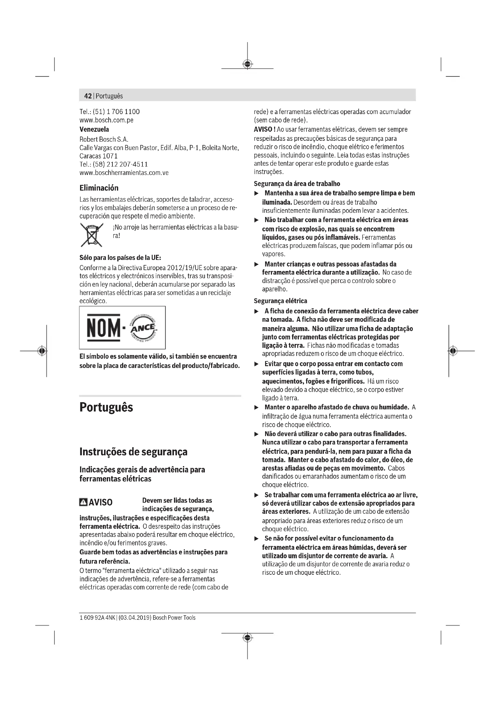 Columna de fijación rápida 2 608 598 111 Depósito de agua a presión 2 609 390 308 Aspirador húmedo/seco GAS 35MAFC Aspirador húmedo/seco GAS 55MAFC Servicio técnico y atención al cliente El servicio técnico le asesorará en las consultas que pueda Ud. tener sobre la reparación y mantenimiento de su produc- to, así como sobre piezas de recambio. Las representacio- nes gráficas tridimensionales e informaciones de repuestos se encuentran también bajo: www.bosch-pt.com El equipo asesor de aplicaciones de Bosch le ayuda gustosa- mente en caso de preguntas sobre nuestros productos y sus accesorios. Para cualquier consulta o pedido de piezas de repuesto es imprescindible indicar el nº de artículo de 10dígitos que fi- gura en la placa de características del producto. España Robert Bosch España S.L.U. Departamento de ventas Herramientas Eléctricas C/Hermanos García Noblejas, 19 28037 Madrid Para efectuar su pedido online de recambios o pedir la reco- gida para la reparación de su máquina, entre en la página www.herramientasbosch.net. Tel. Asesoramiento al cliente: 902 531 553 Fax: 902 531554 Argentina Robert Bosch Argentina S.A. Calle Blanco Encalada 250 – San Isidro Código Postal B1642AMQ Ciudad Autónoma de Buenos Aires Tel.: (54) 11 5296 5200 E-Mail: herramientas.bosch@ar.bosch.com www.argentina.bosch.com.ar Chile Robert Bosch S.A. Calle El Cacique 0258 Providencia – Santiago de Chile Buzón Postal 7750000 Tel.: (56) 02 782 0200 www.bosch.cl Ecuador Robert Bosch Sociedad Anónima Av. Rodrigo Chávez Gonzalez Parque Empresarial Colón Edif. Coloncorp Piso 1 Local 101-102, Guayaquil Tel.: (593) 4 220 4000 E-mail: ventas@bosch.com.ec www.bosch.ec México Robert Bosch S. de R.L. de C.V. Calle Robert Bosch No. 405 C.P. 50071 Zona Industrial, Toluca - Estado de México Tel.: (52) 55 528430-62 Tel.: 800 6271286 www.bosch-herramientas.com.mx Perú Robert Bosch S.A.C. Av. Primavera 781 Piso 2, Urbanización Chacarilla San Borja Lima Bosch Power Tools 1 609 92A 4NK | (03.04.2019)42 | Português Tel.: (51) 1 706 1100 www.bosch.com.pe Venezuela Robert Bosch S.A. Calle Vargas con Buen Pastor, Edif. Alba, P-1, Boleita Norte, Caracas 1071 Tel.: (58) 212 207-4511 www.boschherramientas.com.ve Eliminación Las herramientas eléctricas, soportes de taladrar, acceso- rios y los embalajes deberán someterse a un proceso de re- cuperación que respete el medio ambiente. ¡No arroje las herramientas eléctricas a la basu- ra! Sólo para los países de laUE: Conforme a la Directiva Europea 2012/19/UE sobre apara- tos eléctricos y electrónicos inservibles, tras su transposi- ción en ley nacional, deberán acumularse por separado las herramientas eléctricas para ser sometidas a un reciclaje ecológico. El símbolo es solamente válido, si también se encuentra sobre la placa de características del producto/fabricado. Português Instruções de segurança Indicações gerais de advertência para ferramentas elétricas AVISO Devem ser lidas todas as indicações de segurança, instruções, ilustrações e especificações desta ferramenta eléctrica. O desrespeito das instruções apresentadas abaixo poderá resultar em choque eléctrico, incêndio e/ou ferimentos graves. Guarde bem todas as advertências e instruções para futura referência. O termo "ferramenta eléctrica" utilizado a seguir nas indicações de advertência, refere‑se a ferramentas eléctricas operadas com corrente de rede (com cabo de rede) e a ferramentas eléctricas operadas com acumulador (sem cabo de rede). AVISO ! Ao usar ferramentas elétricas, devem ser sempre respeitadas as precauções básicas de segurança para reduzir o risco de incêndio, choque elétrico e ferimentos pessoais, incluindo o seguinte. Leia todas estas instruções antes de tentar operar este produto e guarde estas instruções. Segurança da área de trabalho u Mantenha a sua área de trabalho sempre limpa e bem iluminada. Desordem ou áreas de trabalho insuficientemente iluminadas podem levar a acidentes. u Não trabalhar com a ferramenta eléctrica em áreas com risco de explosão, nas quais se encontrem líquidos, gases ou pós inflamáveis. Ferramentas eléctricas produzem faíscas, que podem inflamar pós ou vapores. u Manter crianças e outras pessoas afastadas da ferramenta eléctrica durante a utilização. No caso de distracção é possível que perca o controlo sobre o aparelho. Segurança elétrica u A ficha de conexão da ferramenta eléctrica deve caber na tomada. A ficha não deve ser modificada de maneira alguma. Não utilizar uma ficha de adaptação junto com ferramentas eléctricas protegidas por ligação à terra. Fichas não modificadas e tomadas apropriadas reduzem o risco de um choque eléctrico. u Evitar que o corpo possa entrar em contacto com superfícies ligadas à terra, como tubos, aquecimentos, fogões e frigoríficos. Há um risco elevado devido a choque eléctrico, se o corpo estiver ligado à terra. u Manter o aparelho afastado de chuva ou humidade. A infiltração de água numa ferramenta eléctrica aumenta o risco de choque eléctrico. u Não deverá utilizar o cabo para outras finalidades. Nunca utilizar o cabo para transportar a ferramenta eléctrica, para pendurá‑la, nem para puxar a ficha da tomada. Manter o cabo afastado do calor, do óleo, de arestas afiadas ou de peças em movimento. Cabos danificados ou emaranhados aumentam o risco de um choque eléctrico. u Se trabalhar com uma ferramenta eléctrica ao ar livre, só deverá utilizar cabos de extensão apropriados para áreas exteriores. A utilização de um cabo de extensão apropriado para áreas exteriores reduz o risco de um choque eléctrico. u Se não for possível evitar o funcionamento da ferramenta eléctrica em áreas húmidas, deverá ser utilizado um disjuntor de corrente de avaria. A utilização de um disjuntor de corrente de avaria reduz o risco de um choque eléctrico. 1 609 92A 4NK | (03.04.2019) Bosch Power ToolsPortuguês