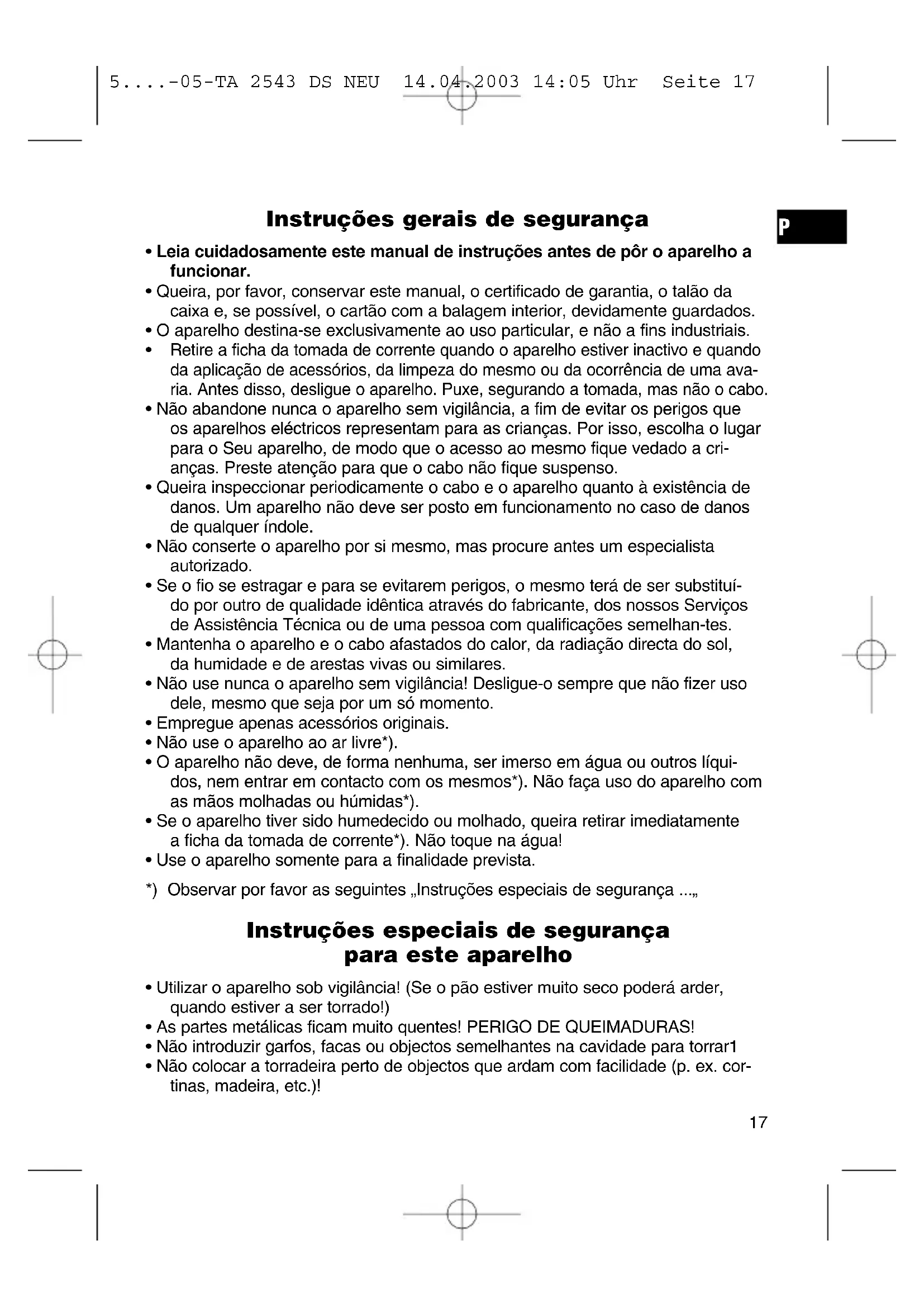 5....-05-TA 2543 DS NEU 14.04.2003 14:05 Uhr Seite 17Antes da primeira utilização Para se remover a camada protectora da espiral térmica, deverá pôr-se o aparelho a funcionar três vezes sem introdução de alimentos e seleccionando-se a tempera- tura máxima. A formação de fumo e cheiros é normal. Deverá arejar-se bem o espaço onde se procede a este acto. Manuseamento