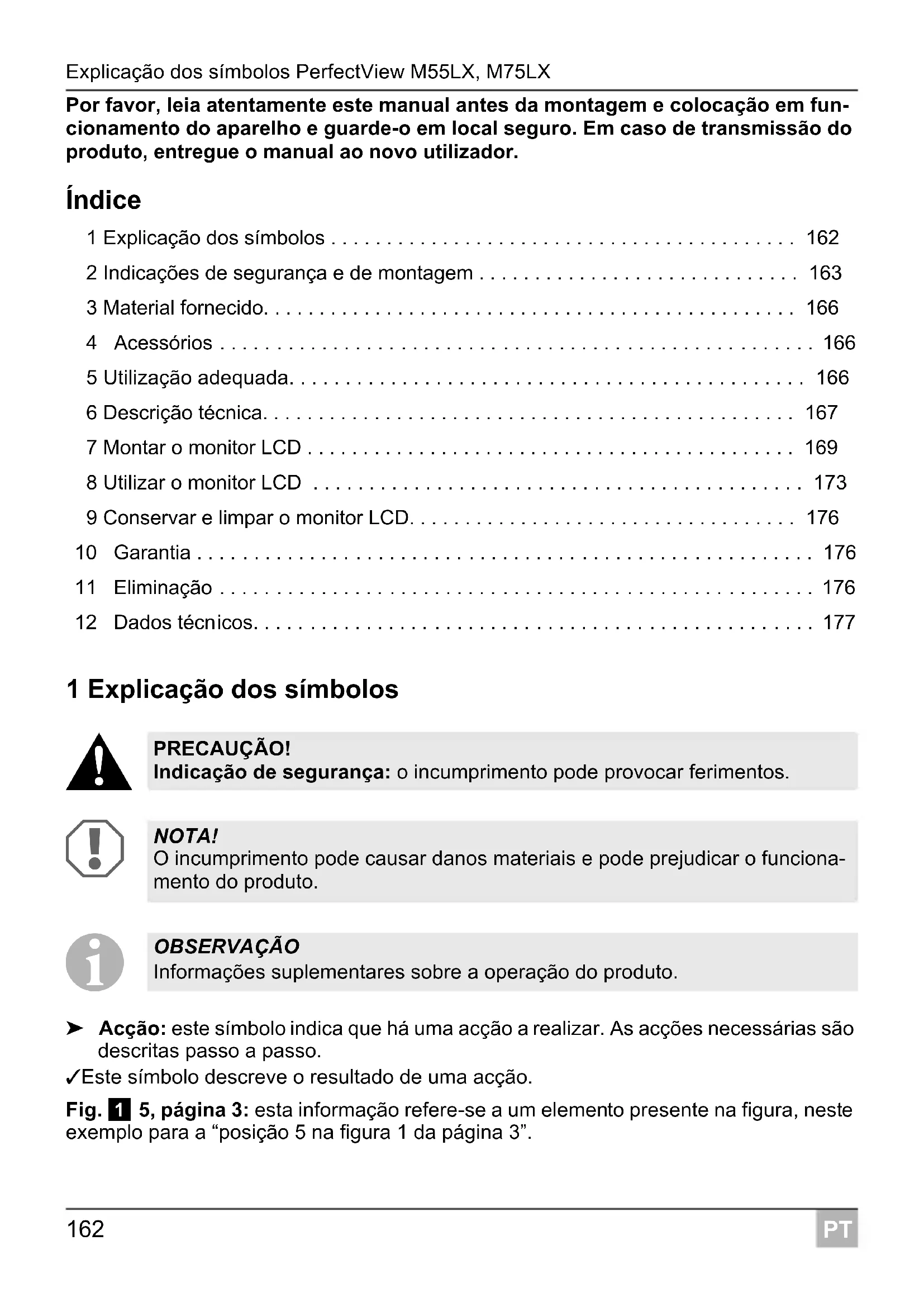 ➤ Acção: este símbolo indica que há uma acção a realizar. As acções necessárias são descritas passo a passo. ✓ Este símbolo descreve o resultado de uma acção. Fig. 1 5, página 3: esta informação refere-se a um elemento presente na figura, neste exemplo para a “posição 5 na figura 1 da página 3”. PRECAUÇÃO! Indicação de segurança: o incumprimento pode provocar ferimentos. NOTA! O incumprimento pode causar danos materiais e pode prejudicar o funciona- mento do produto. OBSERVAÇÃO Informações suplementares sobre a operação do produto.PerfectView M55LX, M75LX Indicações de segurança e de montagem