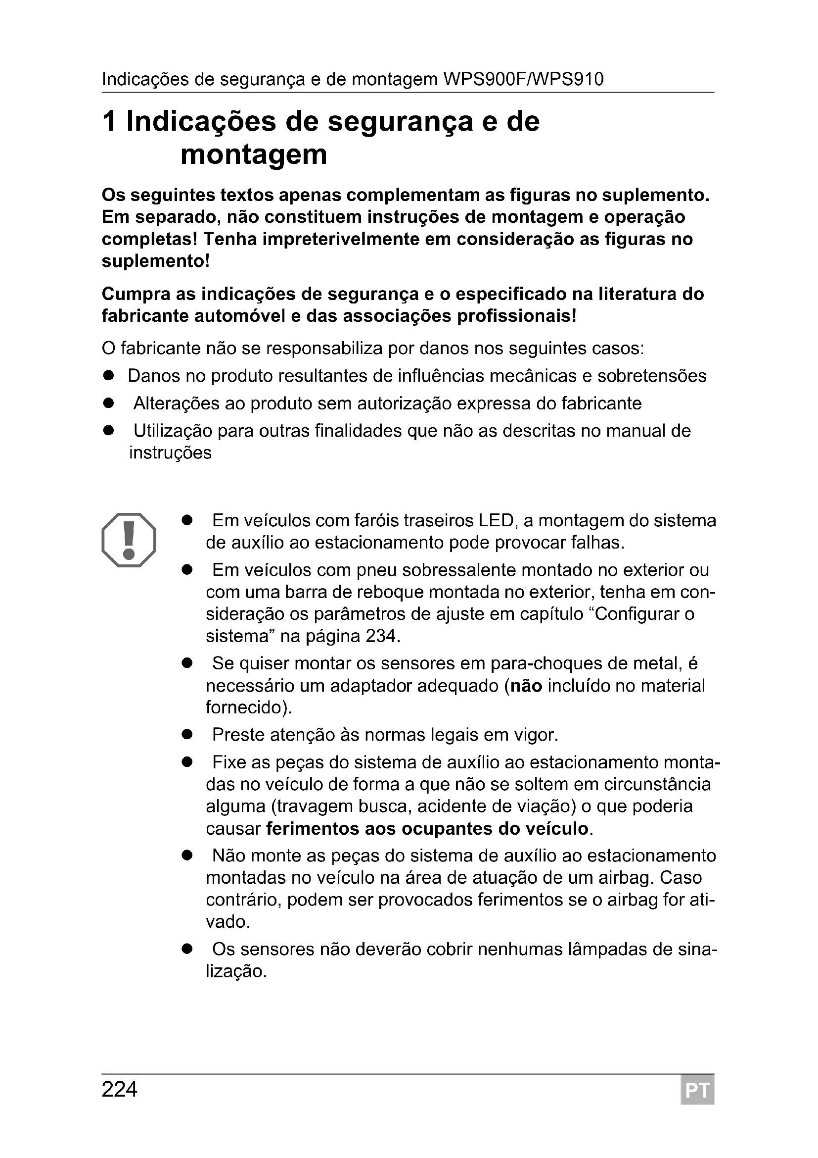 1 Indicações de segurança e de montagem Os seguintes textos apenas complementam as figuras no suplemento. Em separado, não constituem instruções de montagem e operação completas! Tenha impreterivelmente em consideração as figuras no suplemento! Cumpra as indicações de segurança e o especificado na literatura do fabricante automóvel e das associações profissionais! O fabricante não se responsabiliza por danos nos seguintes casos: Danos no produto resultantes de influências mecânicas e sobretensões Alterações ao produto sem autorização expressa do fabricante Utilização para outras finalidades que não as descritas no manual de instruções