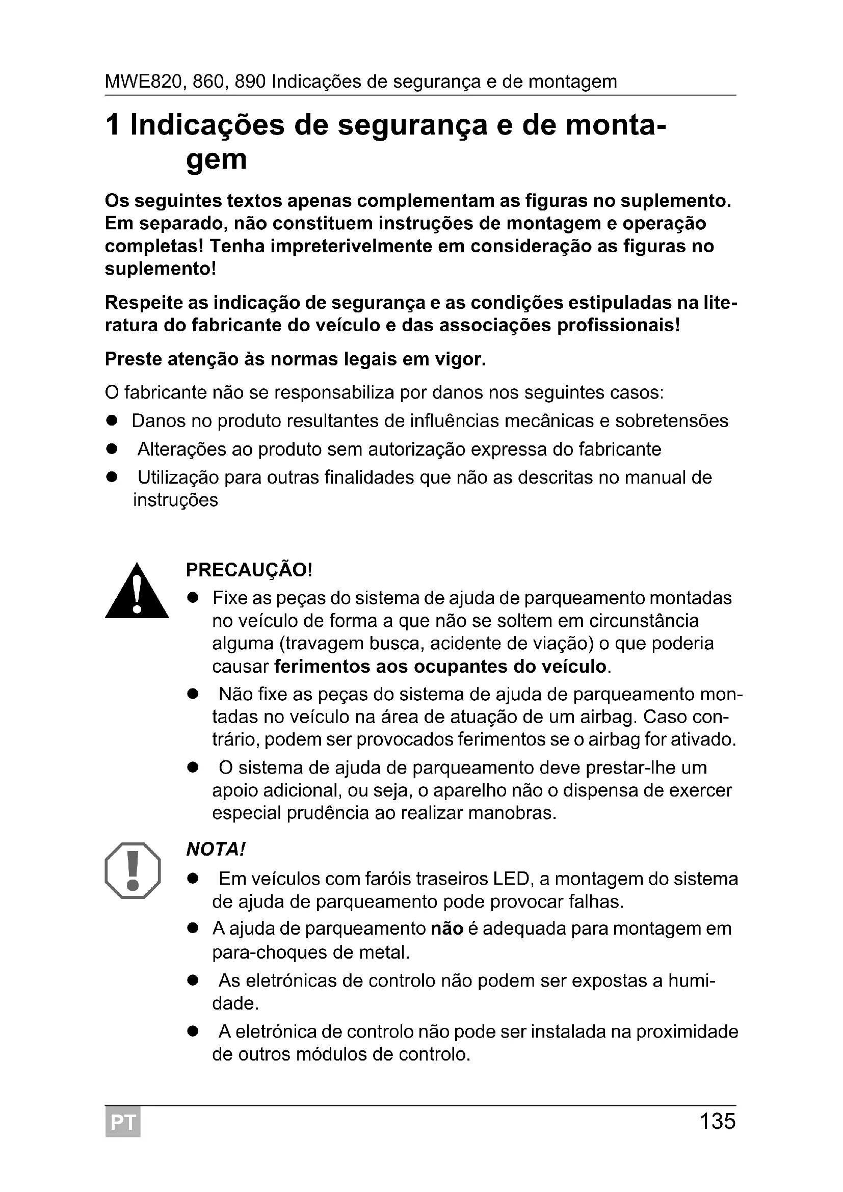 1 Indicações de segurança e de monta- gem Os seguintes textos apenas complementam as figuras no suplemento. Em separado, não constituem instruções de montagem e operação completas! Tenha impreterivelmente em consideração as figuras no suplemento! Respeite as indicação de segurança e as condições estipuladas na lite- ratura do fabricante do veículo e das associações profissionais! Preste atenção às normas legais em vigor. O fabricante não se responsabiliza por danos nos seguintes casos: Danos no produto resultantes de influências mecânicas e sobretensões Alterações ao produto sem autorização expressa do fabricante Utilização para outras finalidades que não as descritas no manual de instruções