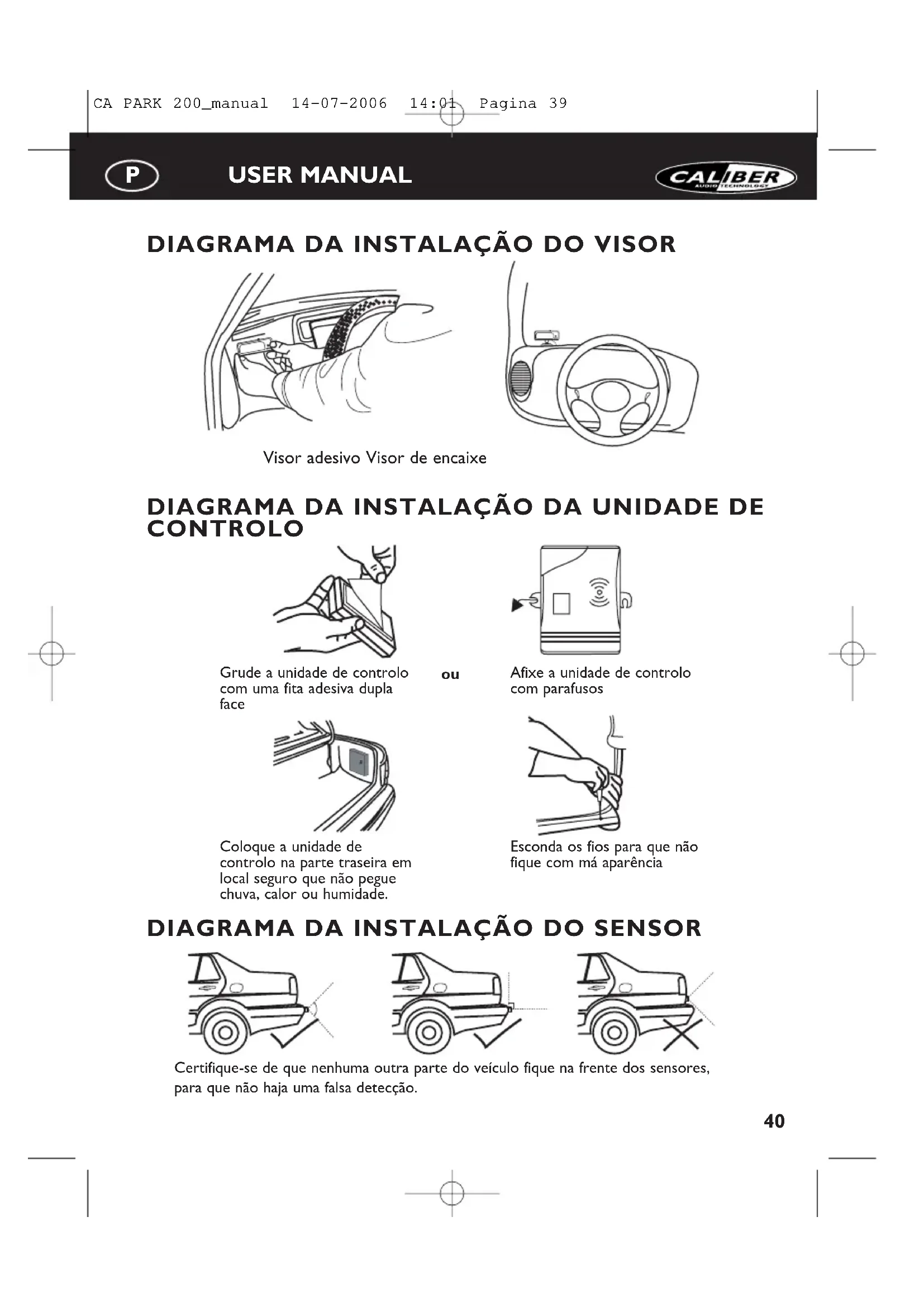 Coloque a unidade de controlo na parte traseira em local seguro que não pegue chuva, calor ou humidade. Esconda os fios para que não fique com má aparência Certifique-se de que nenhuma outra parte do veículo fique na frente dos sensores, para que não haja uma falsa detecção. CA PARK 200_manual 14-07-2006 14:01 Pagina 3941 USER MANUAL