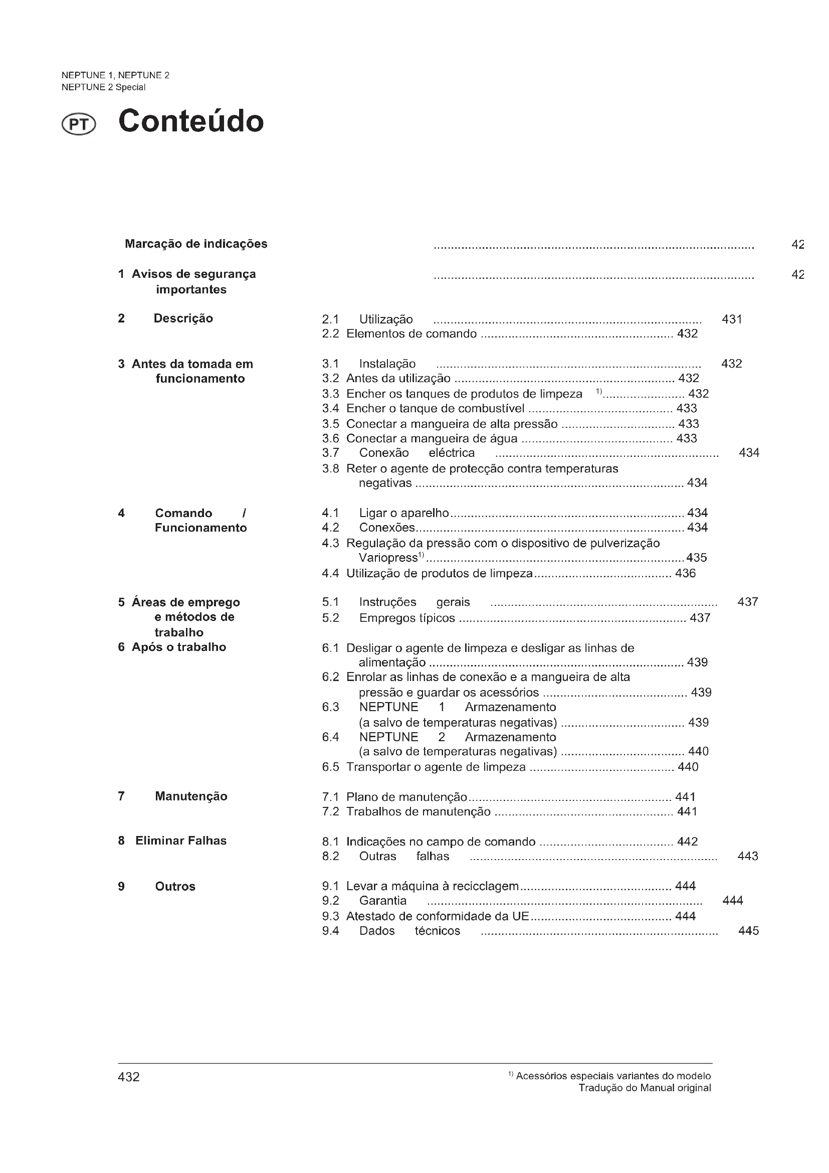 Acessórios especiais variantes do modelo Tradução do Manual original NEPTUNE 1, NEPTUNE 2 NEPTUNE 2 Special Conteúdo Marcação de indicações 1 Avisos de segurança importantes 2 Descrição 3 Antes da tomada em funcionamento 4 Comando / Funcionamento 5 Áreas de emprego e métodos de trabalho 6 Após o trabalho 7 Manutenção 8 Eliminar Falhas 9 Outros