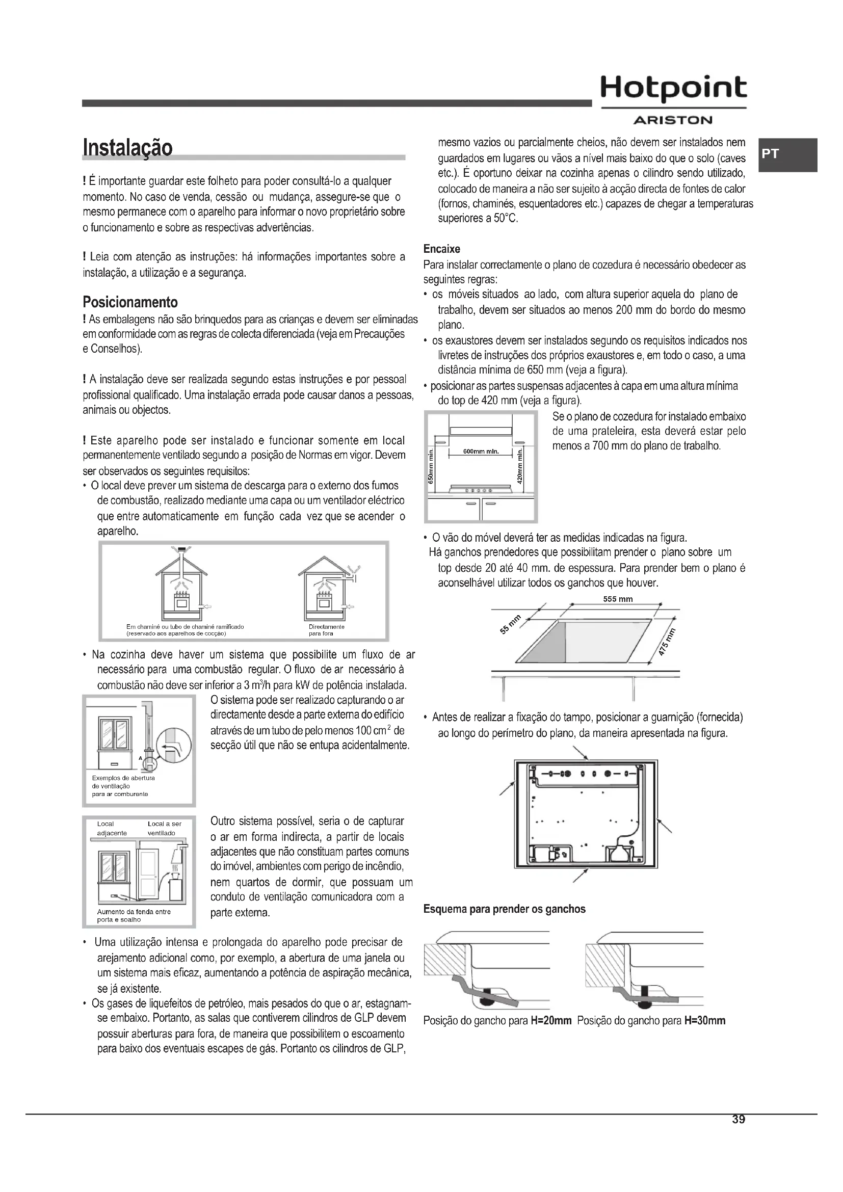 Instalação ! É importante guardar este folheto para poder consultá-lo a qualquer momento. No caso de venda, cessão ou mudança, assegure-se que o mesmo permanece com o aparelho para informar o novo proprietário sobre o funcionamento e sobre as respectivas advertências. ! Leia com atenção as instruções: há informações importantes sobre a instalação, a utilização e a segurança. Posicionamento ! As embalagens não são brinquedos para as crianças e devem ser eliminadas em conformidade com as regras de colecta diferenciada (veja em Precauções e Conselhos). ! A instalação deve ser realizada segundo estas instruções e por pessoal prossional qualicado. Uma instalação errada pode causar danos a pessoas, animais ou objectos. ! Este aparelho pode ser instalado e funcionar somente em local permanentemente ventilado segundo a posição de Normas em vigor. Devem ser observados os seguintes requisitos: