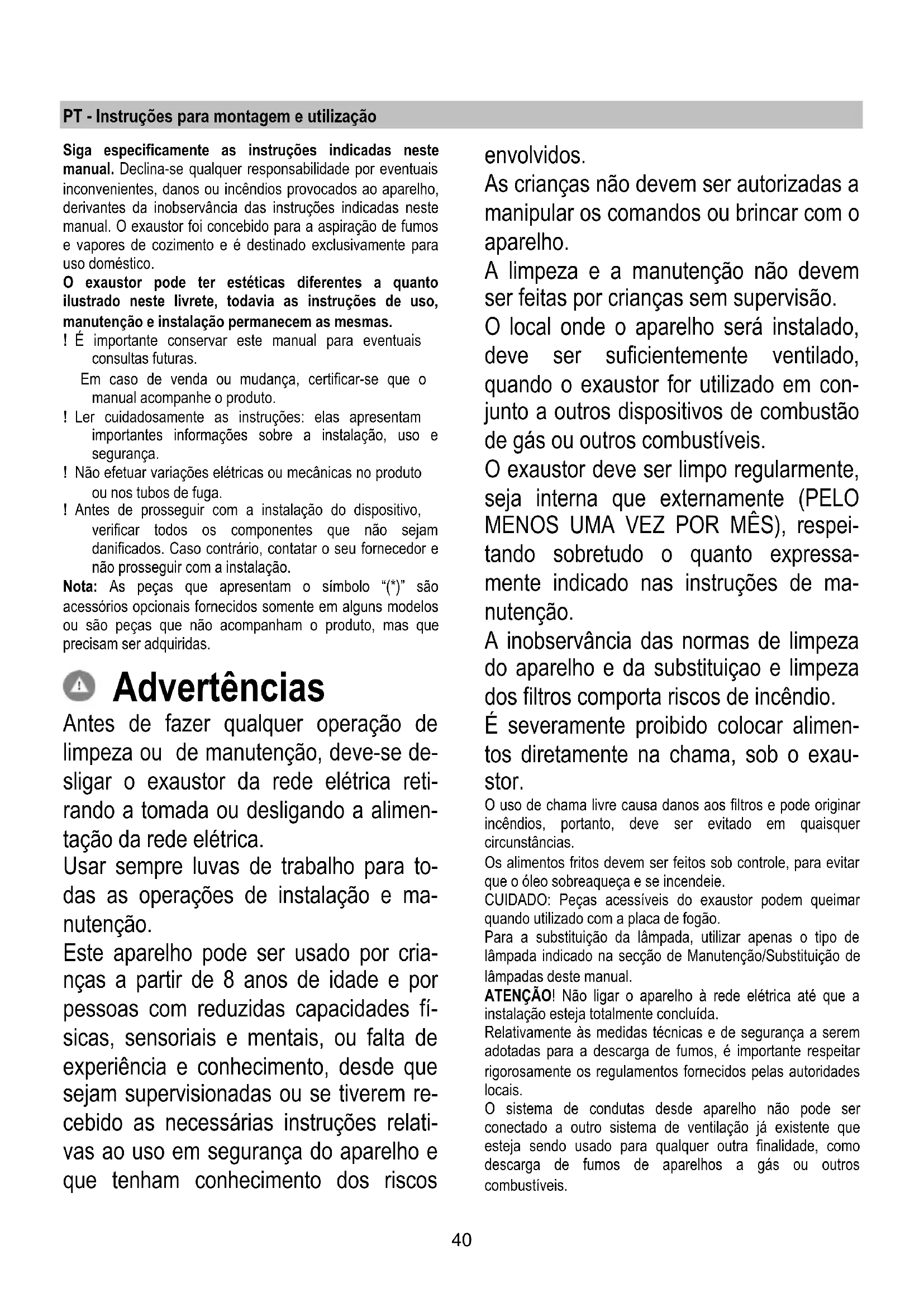 - EMC: EN 55014-1; CISPR 14-1; EN 55014-2; CISPR 14-2; EN/IEC 61000-3-2; EN/IEC 61000-3-3. Sugestões para uma utilização correta, de modo a reduzir o impacto ambiental: LIGUE o exaustor na velocidade mínima quando começar a cozinhar e mantenha-o em função por mais alguns minutos após ter terminado. Aumente a velocidade somente em caso de muita fumaça ou vapor e use as velocidades altas somente em situações extremas. Substitua o(s) filtro(s) a carvão quando necessário, para manter uma boa eficiência na redução dos odores. Limpe o(s) filtro(s) de gordura quando necessário para manter uma boa eficiência. Use o diâmetro máximo do sistema de condutas indicado neste manual para otimizar a eficiência e minimizar o ruído. Uso O exaustor é fabricado para ser utilizado na versão aspirante, com exaustão externa do ar, ou filtrante, com recirculação interna. Versão aspirante Os vapores são evacuados para o exterior, por meio de um tubo de descarga fixado à flange de conexão que se encontra sobre o exaustor. O diâmetro do tubo de descarga deve ser equivalente ao diâmetro do anel de conexão. Se o exaustor for dotado de filtros de carvão ativo, estes deverão ser retirados. Conectar o exaustor aos tubos e orifícios de descarga da parede com diâmetro equivalente a saída de ar (falange de união). O uso de tubos ou orifícios de descarga de parede com diâmetro inferior, pode provocar a diminuição da performance de aspiração e um drástico aumento do ruído. Não nos responsabilizamos a este respeito. ! Utilizar um tubo condutor com o comprimento não inferior ao indicado. ! Utilizar um tubo condutor com o menor número possível de curvas (ângulo máximo da curva: 90ºC 90°). ! Evitar alterações drásticas da seção do tubo (diâmetro). Versão filtrante O ar aspirado será desengordurado e desodorizado antes de ser recanalizado de volta para o ambiente. Para usar o exaustor nesta versão é necessario instalar um sistema de filtragem adicional a base de carvão ativado. Instalação A distância mínima entre a superfície de suporte dos recipientes sobre o fogão e a parte mais baixa do exaustor não deve ser inferior a 50cm no caso de fogões elétricos e 65cm no caso de fogões à gás ou combinados. Se as instruções de instalação do fogão à gás especificarem uma distância maior, deve-se levar em conta esta indicação. Conexão elétrica A voltagem da rede elétrica deve corresponder com a voltagem indicada na etiqueta das características, situada no interior do exaustor. Se dotado de ficha, conectar o exaustor a uma tomada em conformidade com as normas vigentes posta em zona acessível, mesmo depois da instalação. Se não dotada de ficha (conexão direta à rede) ou a tomada não se encontra em zona acessível, mesmo depois da instalação, aplicar um interruptor bipolar, em conformidade com a norma que assegure a desconexão completa da rede nas condições da categoria de sobretensão III, conformemente às regras de instalação.42 Atenção! Antes de conectar novamente o circuito do exaustor com a alimentação elétrica, verificar seu funcionamento, atentar sempre para que o cabo de rede esteja montado corretamente. Atenção! A substituição do cabo de alimentação deve ser efetuada pelo serviço de assistência técnica autorizado de modo a prevenir qualquer risco. Montagem Antes de iniciar a instalação: