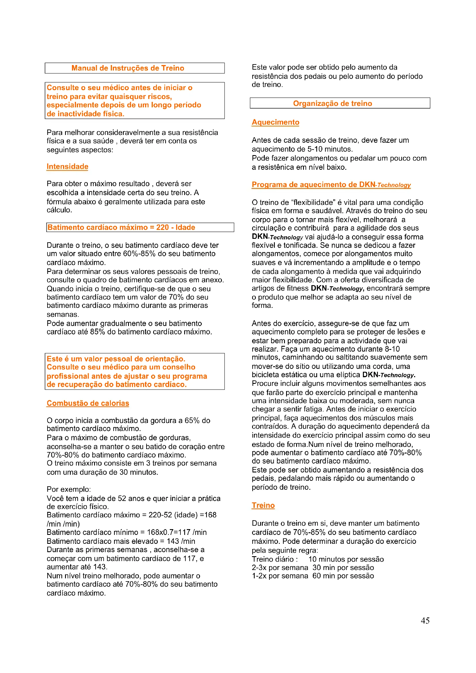 Antes do exercício, assegure-se de que faz um aquecimento completo para se proteger de lesões e estar bem preparado para a actividade que vai realizar. Faça um aquecimento durante 8-10 minutos, caminhando ou saltitando suavemente sem mover-se do sítio ou utilizando uma corda, uma bicicleta estática ou uma elíptica DKN-Technology.
