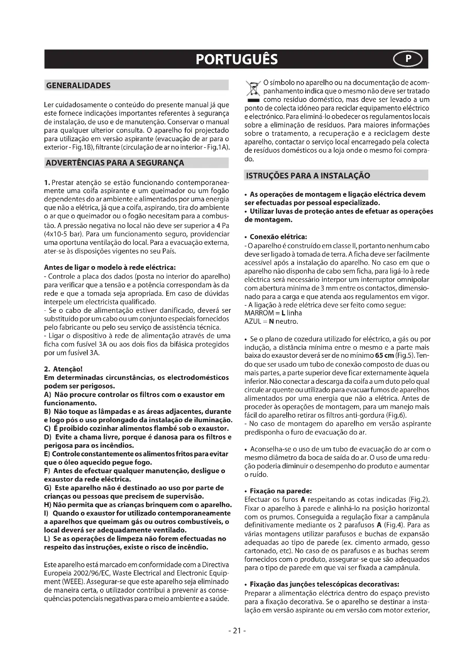 mente uma coifa aspirante e um queimador ou um fogão dependentes do ar ambiente e alimentados por uma energia que não a elétrica, já que a coifa, aspirando, tira do ambiente o ar que o queimador ou o fogão necesitam para a combus- tão. A pressão negativa no local não deve ser superior a 4 Pa (4x10-5 bar). Para um funcionamento seguro, providenciar uma oportuna ventilação do local. Para a evacuação externa, ater-se às disposições vigentes no seu País. Antes de ligar o modelo à rede eléctrica: - Controle a placa dos dados (posta no interior do aparelho) para verificar que a tensão e a potência correspondam às da rede e que a tomada seja apropriada. Em caso de dúvidas interpele um electricista qualificado. - Se o cabo de alimentação estiver danificado, deverá ser substituído por um cabo ou um conjunto especiais fornecidos pelo fabricante ou pelo seu serviço de assistência técnica. - Ligar o dispositivo à rede de alimentação através de uma ficha com fusível 3A ou aos dois fios da bifásica protegidos por um fusível 3A. 2.Atenção! Em determinadas circunstâncias, os electrodomésticos podem ser perigosos. A)Nãoprocurecontrolarosfiltroscomoexaustorem funcionamento. B)Nãotoqueaslâmpadaseasáreasadjacentes,durante elogopósousoprolongadodainstalaçãodeiluminação. C)Éproibidocozinharalimentosflambésoboexaustor. D) Evite a chama livre, porque é danosa para os filtros e perigosa para os incêndios. E) Controle constantemente os alimentos fritos para evitar que o óleo aquecido pegue fogo. F)Antesdeefectuarqualquermanutenção,desligueo exaustordaredeeléctrica. G)Esteaparelhonãoédestinadoaousoporpartede criançasoupessoasqueprecisemdesupervisão. H)Nãopermitaqueascriançasbrinquemcomoaparelho. I)Quandooexaustorforutilizadocontemporaneamente a aparelhos que queimam gás ou outros combustíveis, o local deverá ser adequadamente ventilado. L)Seasoperaçõesdelimpezanãoforemefectuadasno respeitodasinstruções,existeoriscodeincêndio. Este aparelho está marcado em conformidade com a Directiva Europeia 2002/96/EC, Waste Electrical and Electronic Equip- ment (WEEE). Assegurar-se que este aparelho seja eliminado de maneira certa, o utilizador contribui a prevenir as conse- quências potenciais negativas para o meio ambiente e a saúde. PORTUGUÊS