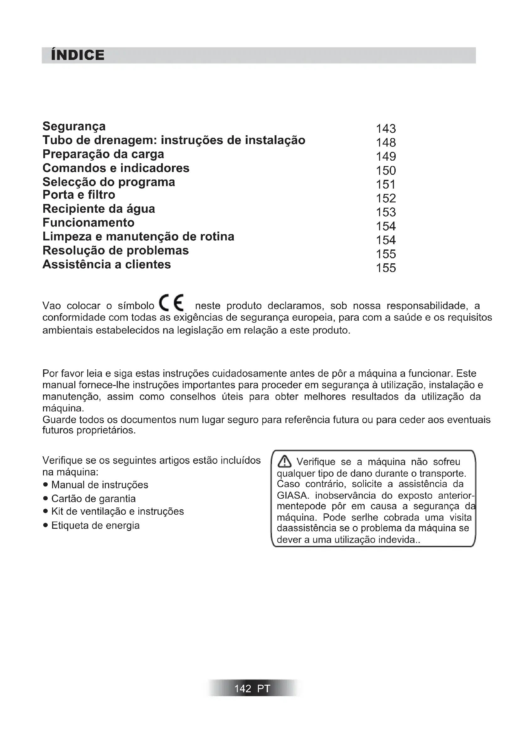 Säkerhetsinformation Avloppsslangsats: Monteringsinstruktioner Förbereda lasten Kontroller & indikatorer Välja program Lucka och filter Vattenbehållare Funktion Rengöring och regelbundet underhåll Felsökning Kundservice142 PT Verifique se os seguintes artigos estão incluídos na máquina: ● Manual de instruções ● Cartão de garantia ● Kit de ventilação e instruções ● Etiqueta de energia Por favor leia e siga estas instruções cuidadosamente antes de pôr a máquina a funcionar. Este manual fornece-lhe instruções importantes para proceder em segurança à utilização, instalação e manutenção, assim como conselhos úteis para obter melhores resultados da utilização da máquina. Guarde todos os documentos num lugar seguro para referência futura ou para ceder aos eventuais futuros proprietários. Verifique se a máquina não sofreu qualquer tipo de dano durante o transporte. Caso contrário, solicite a assistência da GIASA. inobservância do exposto anterior- mentepode pôr em causa a segurança da máquina. Pode serlhe cobrada uma visita daassistência se o problema da máquina se dever a uma utilização indevida.. ÍNDICE Vao colocar o símbolo neste produto declaramos, sob nossa responsabilidade, a conformidade com todas as exigências de segurança europeia, para com a saúde e os requisitos ambientais estabelecidos na legislação em relação a este produto.