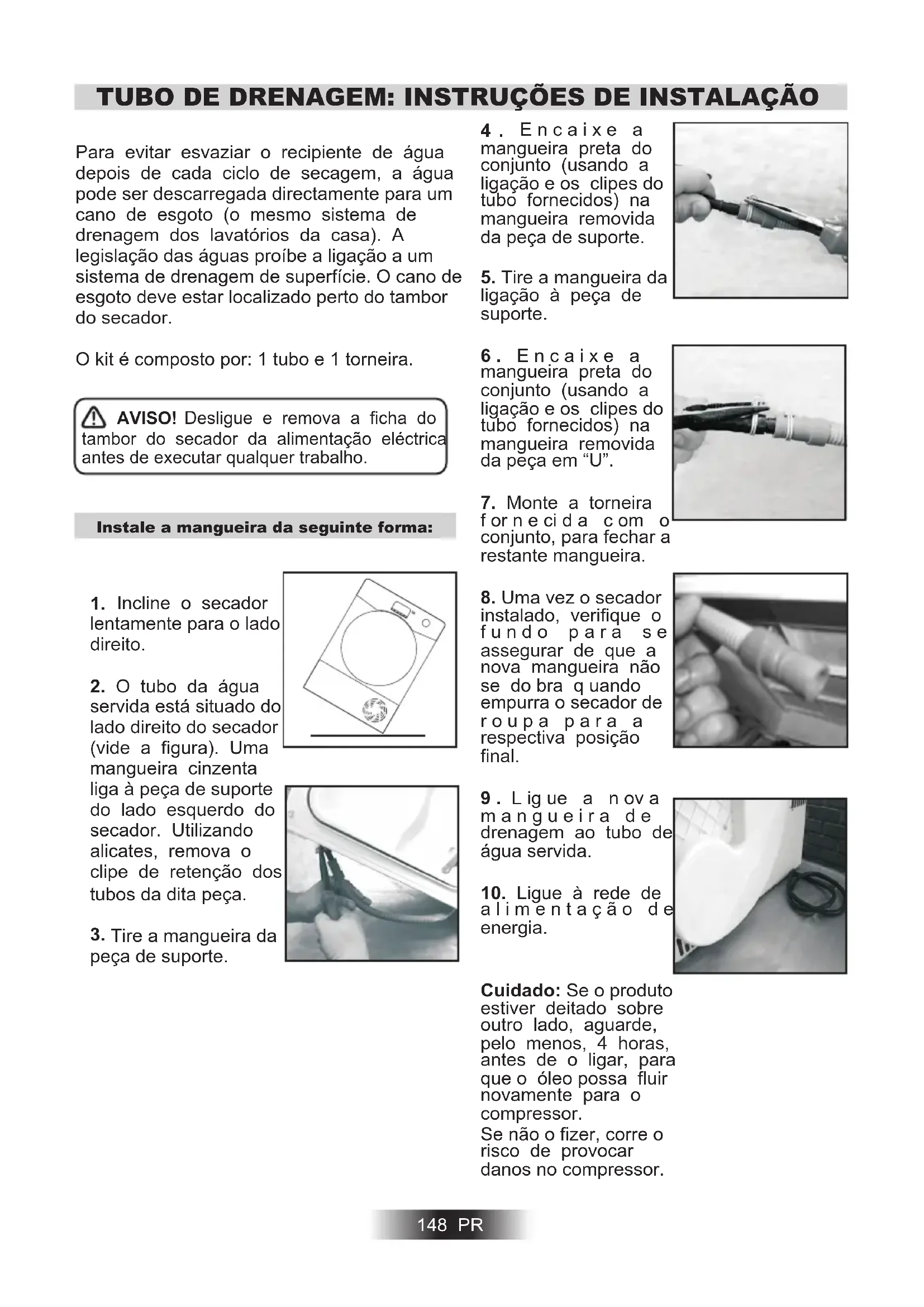 Preparação da carga Comandos e indicadores Selecção do programa Porta e filtro Recipiente da água Funcionamento Limpeza e manutenção de rotina Resolução de problemas Assistência a clientes ubo de drenagem: instruções de instalação144 PR ● Não permita que as crianças brinquem com a máquina ou os respectivos controlos. ● ATENÇÃO Não utilize o produto se o filtro de cotão não estiver bem posicionado ou se estiver danificado; o cotão é inflamável. ● ATENÇÃO O aumento de temperatura durante o funcionamento da máquina de secar pode exceder os 60 graus C, onde exista o símbolo de superfície quente . ● Retire a ficha da tomada de corrente eléctrica. Faça o mesmo antes de limpar a máquina. ● Não insista em utilizar a máquina, se lhe parecer que existe qualquer avaria. ● Não deixe que se acumulem partículas de fibras e cotão em torno da máquina. ● O interior do tambor pode estar muito quente. Antes de retirar a roupa, deixe sempre a máquina de secar completar o período de arrefecimento. ● A parte final de um ciclo de secagem ocorre sem calor (é o ciclo de arrefecimento) para assegurar que as peças ficam a uma temperatura que assegure que não são danificadas. ●O secador de roupa não deve ser utilizado para secar roupas que tenham sido limpas com produtos químicos industriais. ● AVISO: Nunca pare uma máquina de secar roupa antes do fim do ciclo de secagem, a menos que todas as peças de roupa sejam rapidamente removidas e espalhadas para que o calor se dissipe. ● Peso máximo de carga de secagem: Consulte a etiqueta de eficiência energética. ● Não utilize adaptadores, vários conectores e/ou extensões. ● Nunca instale a máquina junto a cortinas e tenha o cuidado de evitar a queda ou acumulação de objectos atrás da mesma. ● O equipamento não deve ser instalado atrás de uma porta que bloqueie, deslizante ou que tenha uma dobradiça no lado oposto ao do secador de tambor. Importante: Durante o transporte assegure-se de que o secador é mantido na vertical; se necessário pode virá-lo apenas para o lado indicado na figura; Cuidado: Se o produto estiver deitado sobre outro lado, aguarde, pelo menos, 4 horas, antes de o ligar, para que o óleo possa fluir novamente para o compressor. Se não o fizer, corre o risco de provocar danos no compressor. Instalação0 EN6 Air Outlets in the Base A sala onde está localizada a máquina de secar deve possuir uma ventilação adequada para evitar que os gases provenientes dos electrodomésticos queimem outros combustíveis, incluindo chamas vivas, que sejam atraídos à sala durante o funcionamento da máquina de secar. ●Instale a máquina com a parte traseira do aparelho perto de uma parede. ● O ar de exaustão não pode ser eliminado pelo tubo de chaminé que é utilizado para os fumos de exaustão de electrodomésticos que queimem gás ou outros combustíveis. ● Verifique regularmente se nada está a limitar o fluxo de ar na máquina. ●Verifique com frequência a limpeza do filtro , pois é natural que este tenha cotão acumulado após cada utilização. ● Deve haver uma distância de, pelo menos, 12 mm entre a máquina e quaisquer obstrucções, paredes, móveis ou outros objectos. A zona de carregamento e retirada da roupa deve ser mantida livre de obstrucções, bem como as saídas de ar. Para garantir a ventilação adequada não deve existir nenhuma obstrução entre a máquina e o chão onde esta se encontra colocada. ● Evite que caiam e se acumulem objectos atrás e ao lado da máquina, uma vez que podem obstruir a entrada e saída de ar. ● NUNCA instale a máquina junto a cortinas. ●Nos casos em que o secador é instalado por cima de uma máquina de lavar roupa, deve ser utilizado um "kit de empilhamento" adequado e de acordo com a sequência de configuração. Kit de empilhamento Mod: 35100019 para a profundidade mínima da máquina de lavar roupa = 49 centímetros Kit de empilhamento Mod: 35900120 para a profundidade mínima da máquina de lavar roupa = 51cm O kit de empilhamento deve ser um dos indicados anteriormente e deve ser obtido através dos serviços da marca. As instruções para instalação e todos os anexos respeitantes à fixação do kit, são fornecidos com o mesmo. VENTILAÇÃO 146 PR Não instale o produto numa sala com baixas temperaturas ou onde exista o risco de ocorrência de congelação. Com temperaturas em torno do pontos de congelação, o produto pode não ser capaz de funcionar correctamente: há o risco de danos no aparelho se a água congelar no circuito hidráulico (válvulas, mangueiras, tubos). Para um melhor desempenho do produto a temperatura ambiente da sala onde este está instalado deve estar entre os 2ºC e os 35ºC. Por favor tome em consideração que o funcionamento em condições de temperaturas mais baixas (entre os 2ºC e os 15ºC) pode gerar alguma condensação de água e pode acontecer que alguma água escorra para o chão.TUBO DE DRENAGEM: INSTRUÇÕES DE INSTALAÇÃO Instale a mangueira da seguinte forma: 148 PR AVISO! tambor do secador da alimentação eléctrica antes de executar qualquer trabalho. Desligue e remova a ficha do Para evitar esvaziar o recipiente de água depois de cada ciclo de secagem, a água pode ser descarregada directamente para um cano de esgoto (o mesmo sistema de drenagem dos lavatórios da casa). A legislação das águas proíbe a ligação a um sistema de drenagem de superfície. O cano de esgoto deve estar localizado perto do tambor do secador. O kit é composto por: 1 tubo e 1 torneira.