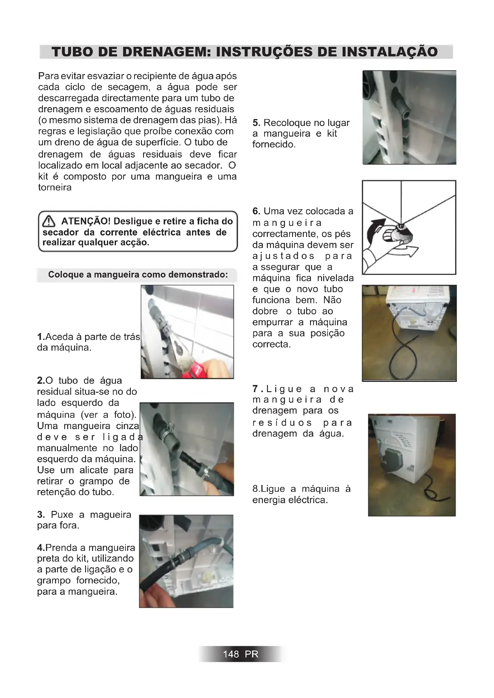 m a n g u e i r a correctamente, os pés da máquina devem ser a j u s t a d o s p a r a a ssegurar que a máquina fica nivelada e que o novo tubo funciona bem. Não dobre o tubo ao empurrar a máquina para a sua posição correcta. 7 . L i g u e a n o v a m a n g u e i r a d e drenagem para os r e s í d u o s p a r a drenagem da água. 8.Ligue a máquina à energia eléctrica. Para evitar esvaziar o recipiente de água após cada ciclo de secagem, a água pode ser descarregada directamente para um tubo de drenagem e escoamento de águas residuais (o mesmo sistema de drenagem das pias). Há regras e legislação que proíbe conexão com um dreno de água de superfície. O tubo de drenagem de águas residuais deve ficar localizado em local adjacente ao secador. O kit é composto por uma mangueira e uma torneira10 Kg 9 Kg 8 Kg 7 Kg 6 Kg 4 Kg 4 Kg 4 Kg 3,5 Kg 3 KgMax. Max. Algodões Sintéticos 149 PR