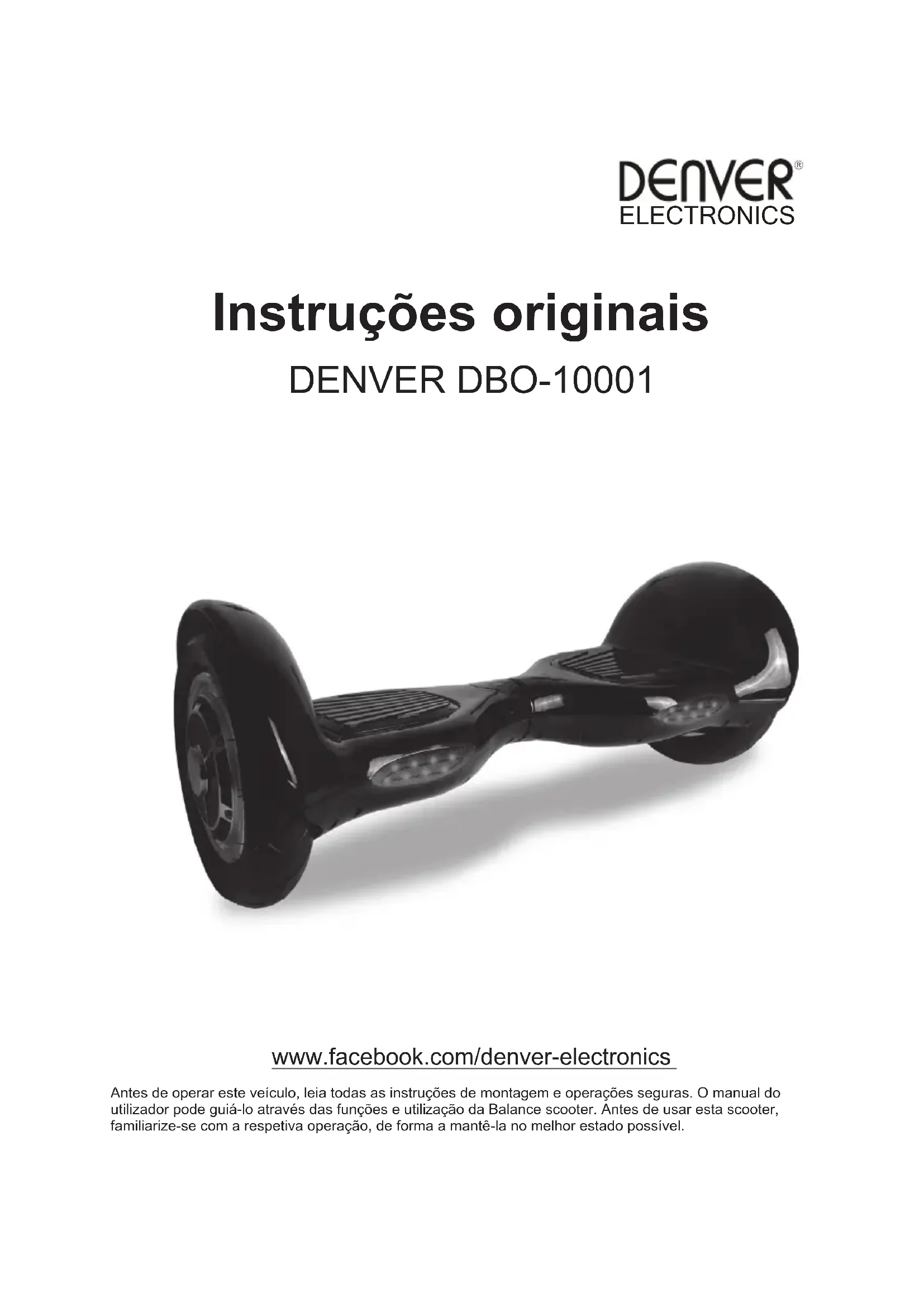Dania Omega 5A, Soeften, DK-8382 Hinnerup, POL 8Instruções originais DENVER DBO-10001 www.facebook.com/denver-electronics Antes de operar este veículo, leia todas as instruções de montagem e operações seguras. O manual do utilizador pode guiá-lo através das funções e utilização da Balance scooter. Antes de usar esta scooter, familiarize-se com a respetiva operação, de forma a mantê-la no melhor estado possível.