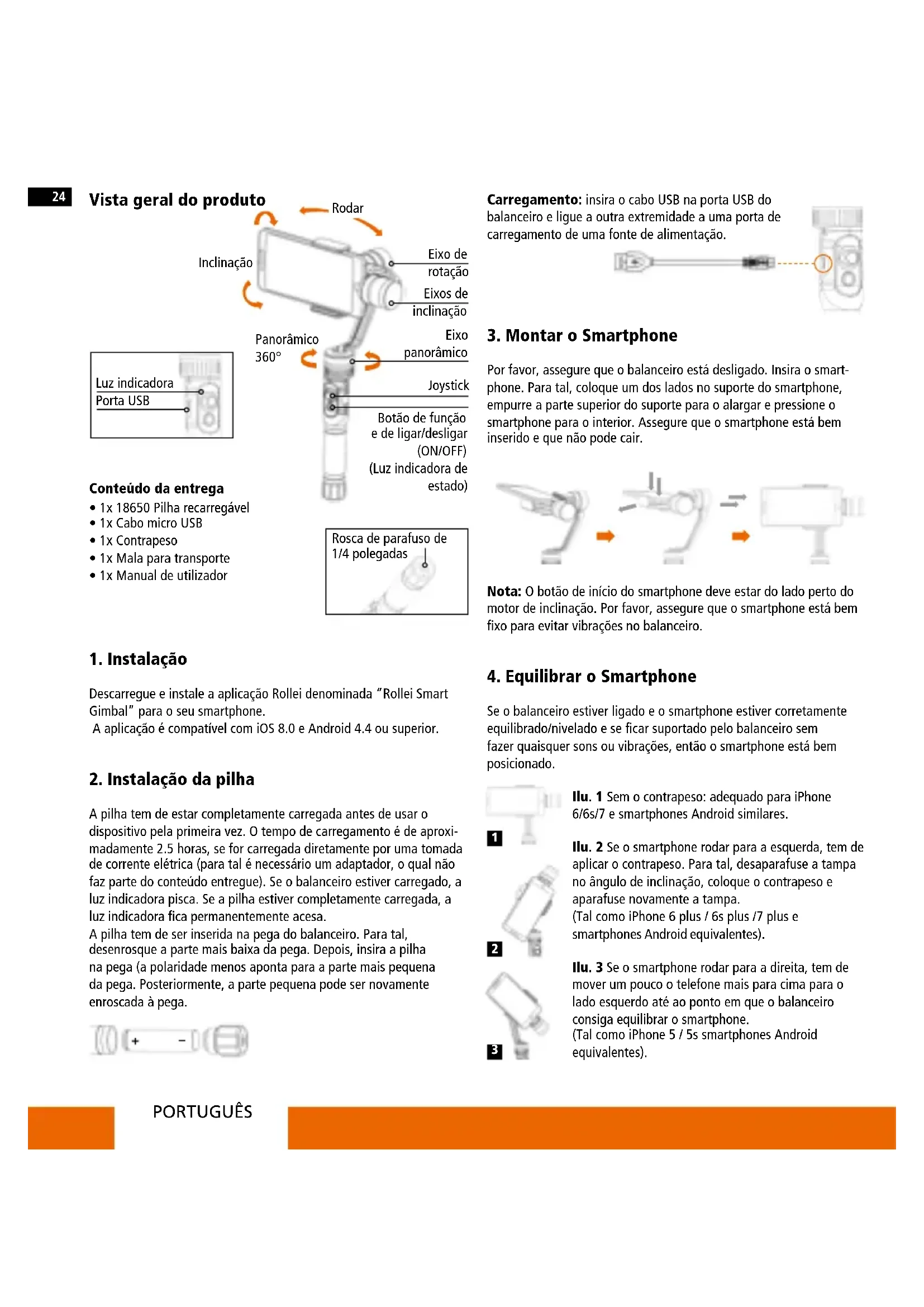 - 1x Manual de utilizador Nota: O botão de início do smartphone deve estar do lado perto do motor de inclinação. Por favor, assegure que o smartphone está bem fixo para evitar vibrações no balanceiro.