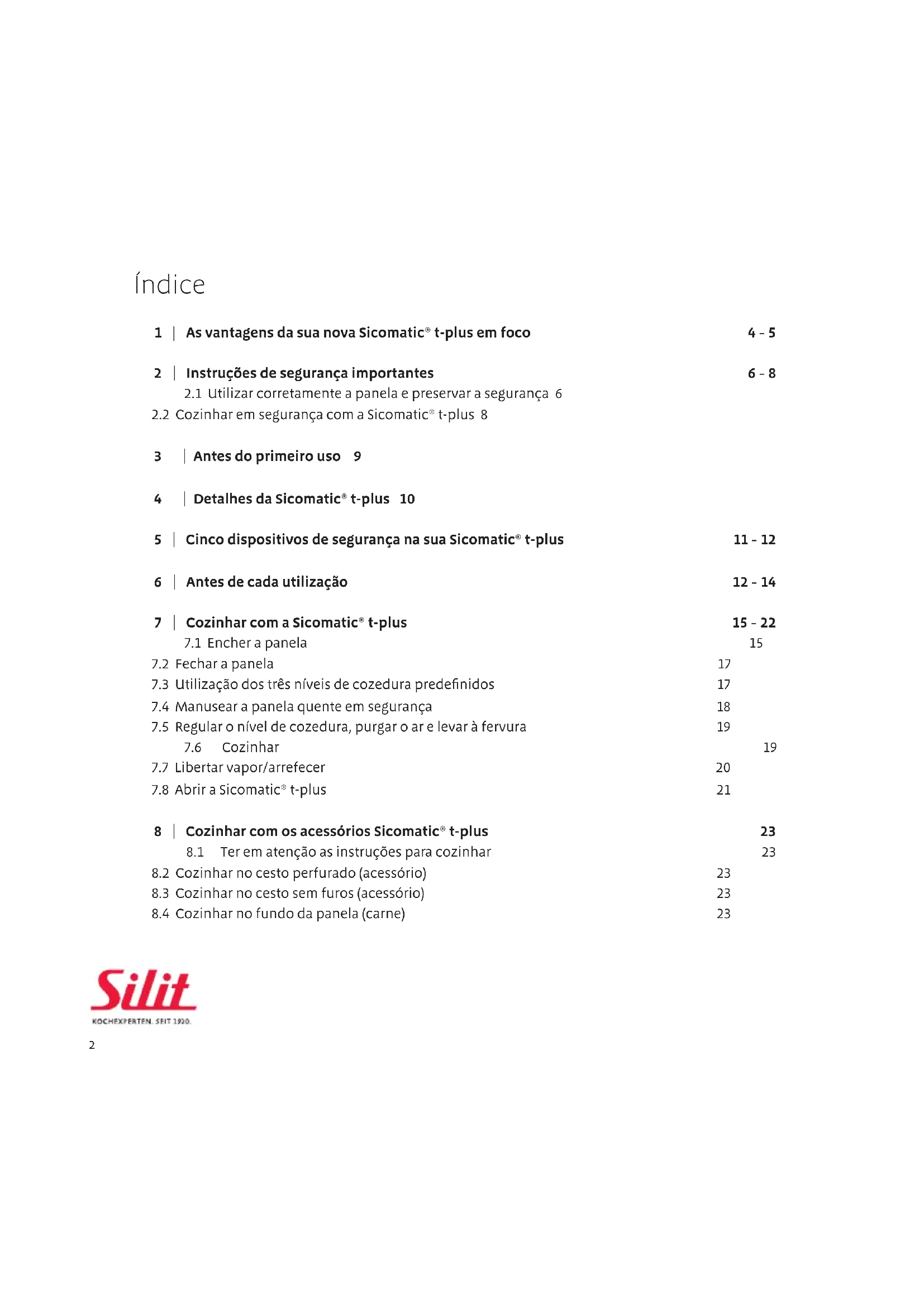 3 | Antes do primeiro uso 9 4 | Detalhes da Sicomatic® t-plus 10 5 | Cinco dispositivos de segurança na sua Sicomatic® t-plus 11 - 12 6 | Antes de cada utilização 12 - 14 7 | Cozinhar com a Sicomatic® t-plus 15 - 22