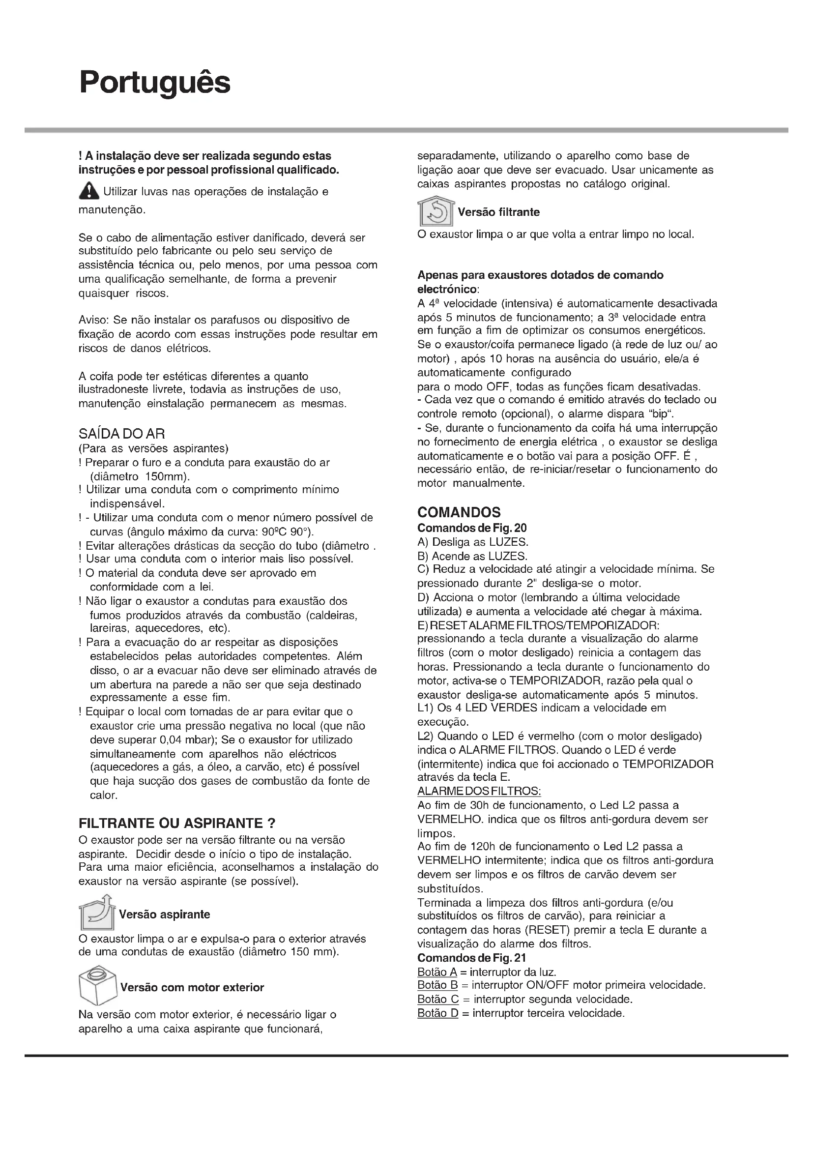 (Para as versões aspirantes) ! Preparar o furo e a conduta para exaustão do ar (diâmetro 150mm). ! Utilizar uma conduta com o comprimento mínimo indispensável. ! - Utilizar uma conduta com o menor número possível de curvas (ângulo máximo da curva: 90ºC 90°). ! Evitar alterações drásticas da secção do tubo (diâmetro . ! Usar uma conduta com o interior mais liso possível. ! O material da conduta deve ser aprovado em conformidade com a lei. ! Não ligar o exaustor a condutas para exaustão dos fumos produzidos através da combustão (caldeiras, lareiras, aquecedores, etc). ! Para a evacuação do ar respeitar as disposições estabelecidos pelas autoridades competentes. Além disso, o ar a evacuar não deve ser eliminado através de um abertura na parede a não ser que seja destinado expressamente a esse fim. ! Equipar o local com tomadas de ar para evitar que o exaustor crie uma pressão negativa no local (que não deve superar 0,04 mbar); Se o exaustor for utilizado simultaneamente com aparelhos não eléctricos (aquecedores a gás, a óleo, a carvão, etc) é possível que haja sucção dos gases de combustão da fonte de calor. FILTRANTE OU ASPIRANTE ? O exaustor pode ser na versão filtrante ou na versão aspirante. Decidir desde o início o tipo de instalação. Para uma maior eficiência, aconselhamos a instalação do exaustor na versão aspirante (se possível). Versão aspirante O exaustor limpa o ar e expulsa-o para o exterior através de uma condutas de exaustão (diâmetro 150 mm). Versão com motor exterior Na versão com motor exterior, é necessário ligar o aparelho a uma caixa aspirante que funcionará, separadamente, utilizando o aparelho como base de ligação aoar que deve ser evacuado. Usar unicamente as caixas aspirantes propostas no catálogo original. Versão filtrante O exaustor limpa o ar que volta a entrar limpo no local. Apenas para exaustores dotados de comando electrónico: A 4ª velocidade (intensiva) é automaticamente desactivada após 5 minutos de funcionamento; a 3ª velocidade entra em função a fim de optimizar os consumos energéticos. Se o exaustor/coifa permanece ligado (à rede de luz ou/ ao motor) , após 10 horas na ausência do usuário, ele/a é automaticamente configurado para o modo OFF, todas as funções ficam desativadas. - Cada vez que o comando é emitido através do teclado ou controle remoto (opcional), o alarme dispara “bip“. - Se, durante o funcionamento da coifa há uma interrupção no fornecimento de energia elétrica , o exaustor se desliga automaticamente e o botão vai para a posição OFF. É , necessário então, de re-iniciar/resetar o funcionamento do motor manualmente. COMANDOS Comandos de Fig. 20 A) Desliga as LUZES. B) Acende as LUZES. C) Reduz a velocidade até atingir a velocidade mínima. Se pressionado durante 2" desliga-se o motor. D) Acciona o motor (lembrando a última velocidade utilizada) e aumenta a velocidade até chegar à máxima. E) RESET ALARME FILTROS/TEMPORIZADOR: pressionando a tecla durante a visualização do alarme filtros (com o motor desligado) reinicia a contagem das horas. Pressionando a tecla durante o funcionamento do motor, activa-se o TEMPORIZADOR, razão pela qual o exaustor desliga-se automaticamente após 5 minutos. L1) Os 4 LED VERDES indicam a velocidade em execução. L2) Quando o LED é vermelho (com o motor desligado) indica o ALARME FILTROS. Quando o LED é verde (intermitente) indica que foi accionado o TEMPORIZADOR através da tecla E. ALARME DOS FILTROS: Ao fim de 30h de funcionamento, o Led L2 passa a VERMELHO. indica que os filtros anti-gordura devem ser limpos. Ao fim de 120h de funcionamento o Led L2 passa a VERMELHO intermitente; indica que os filtros anti-gordura devem ser limpos e os filtros de carvão devem ser substituídos. Terminada a limpeza dos filtros anti-gordura (e/ou substituídos os filtros de carvão), para reiniciar a contagem das horas (RESET) premir a tecla E durante a visualização do alarme dos filtros. Comandos de Fig. 21 Botão A = interruptor da luz. Botão B = interruptor ON/OFF motor primeira velocidade. Botão C = interruptor segunda velocidade. Botão D = interruptor terceira velocidade.Comandos de Fig. 22 P1: Liga e desliga as LUZES P2: Liga o motor com a primeira velocidade (o ícone fica iluminado). Os outros ícones relacionados com a velocidade ficam desligados. P3: Liga o motor com a segunda velocidade (o ícone fica iluminado). Os outros ícones relacionados com a velocidade ficam desligados. P4: Liga o motor com a terceira velocidade (o ícone fica iluminado). Os outros ícones relacionados com a velocidade ficam desligados. P5: Liga o motor com a quarta velocidade (o ícone fica piscando). Os outros ícones relacionados com a velocidade ficam desligados. A velocidade máxima foi configurada para, no máximo, 5 minutos, depois desse tempo, muda automaticamente para a terceira velocidade. P6: Liga o TIMER (o ícone fica iluminado). Ligando o Timer (5 minutos), o motor para de funcionar automaticamente depois de 5 minutos. P7: ALARME DOS FILTROS. Depois de 30 horas de funcionamento, o ícone fica iluminado, para indicar que é preciso limpar o filtro antigorduras. Depois de 120 horas de funcionamento o ícone fica iluminado para indicar que é preciso limpar o filtro antigorduras e trocar os filtros carbónicos. Para REINICIAR o alarme, é preciso apertar o ícone enquanto o mesmo permanece iluminado (ou enquanto está piscando). Comandos de Fig. 23-24 Botão TC1 (LUZ): ligar / desligar farol ON / OFF. Quando o farol principal é ligado , BL1 muda de cor e fica ligado.Após pressionar e segurar o botão, ligar / desligar, farois auxiliares (opcionais). Botão TC2 (motor - V1): ON / OFF Motor- Liga o motor com a primeira rotação. Botão TC3 (motor - V2): liga o motor com a segunda rotação. Botão TC4 (motor - V3): liga o motor com a terceira rotação. Botão TC5 (motor - V4): liga o motor com a quarta rotação. A dur