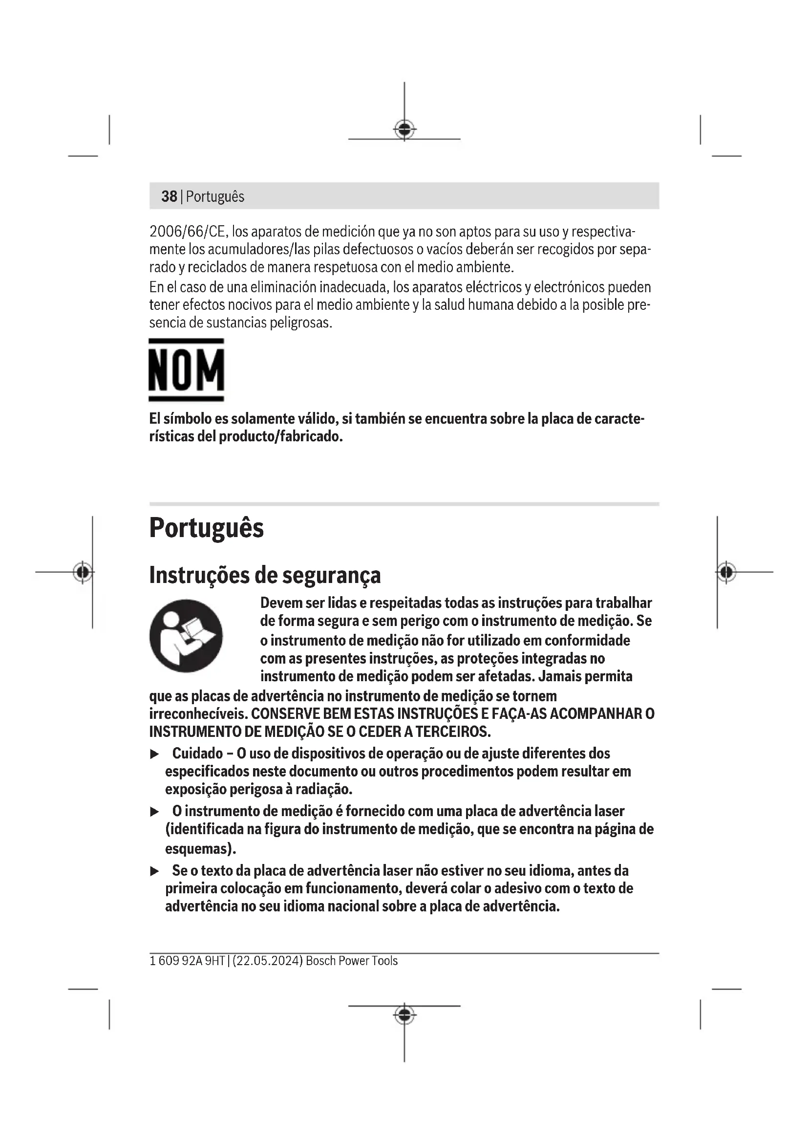 a 20–25°C C) Os valores indicados pressupõem condições ambiente normais a favoráveis (p. ex. ausência de vibração, nevoeiro, fumo, radiação solar direta). Após fortes oscilações de temperatura podem ocorrer desvios de precisão. D) Só surge sujidade não condutora, mas ocasionalmente é esperada uma condutividade temporária causada por condensação. E) Peso sem pilhas/baterias Para uma identificação inequívoca do seu instrumento de medição, consulte o número de série (10) na placa de identificação. Bosch Power Tools 1 609 92A 9HT | (22.05.2024)42 | Português Montagem Colocar/trocar pilhas Para o funcionamento do instrumento de medição é recomendável usar pilhas alcalinas de manganés ou baterias. Para abrir a tampa do compartimento das pilhas(8) prima o travamento(7) e retire a tampa. Insira as pilhas ou baterias. Tenha atenção à polaridade correta de acordo com a representação no interior do compartimento das pilhas. Se as pilhas ou baterias estiverem descarregadas, o indicador de estado(3) acende-se a vermelho e as linhas laser desligam-se. Desligue o instrumento de medição e troque as pilhas ou baterias. Sempre substituir todas as pilhas ou as baterias ao mesmo tempo. Só utilizar pilhas ou as baterias de um só fabricante e com a mesma capacidade. u Retire as pilhas ou as baterias do instrumento de medição se não o for usar durante um período de tempo prolongado. As pilhas e baterias podem ficar corroídas se forem armazenadas durante muito tempo no instrumento de medição. Funcionamento Colocação em funcionamento u Proteja o instrumento de medição da humidade e da radiação solar direta. u Não exponha o instrumento de medição a temperaturas extremas ou oscilações de temperatura. Não os deixe, p. ex., ficar durante muito tempo no automóvel. No caso de oscilações de temperatura maiores, deixe o instrumento de medição atingir a temperatura ambiente antes de o utilizar. No caso de temperaturas ou de oscilações de temperatura extremas é possível que a precisão do instrumento de medição seja prejudicada. u Evite quedas ou embates violentos com o instrumento de medição. Os danos causados no instrumento de medição podem afetar a precisão de medição. Após uma pancada ou uma queda forte, compare a linha laser para efeitos de controlo com uma linha de referência vertical ou horizontal conhecida. u Desligue o instrumento de medição quando o transporta. A unidade pendular é bloqueada logo que o instrumento for desligado, caso contrário poderia ser danificado devido a fortes movimentos. 1 609 92A 9HT | (22.05.2024) Bosch Power ToolsPortuguês | 43 Ligar/desligar Para ligar o instrumento de medição, desloque o interruptor de ligar/desligar(5) para a posição ON. Imediatamente após a ligação, o instrumento de medição projeta linhas laser a partir do ponto de saída frontal (1). u Não apontar o raio de laser na direção de pessoas nem de animais e não olhar no raio laser, nem mesmo de maiores distâncias. Para desligar o instrumento de medição, desloque o interruptor de ligar/desligar (5) para a posição OFF. Ao desligar, a unidade pendular bloqueia. u Não deixe o instrumento de medição ligado sem vigilância e desligue o instrumento de medição após utilização. Outras pessoas poderiam ser cegadas pelo raio laser. Modos de operação O instrumento de medição dispõe de vários tipos de funcionamento, entre os quais poderá comutar sempre que desejar: – Modo de operação linhas cruzadas (ver figurasA−B): cria uma linha laser horizontal e outra vertical, – Modo de linhas cruzadas e de ponto de prumada (ver figuraC): cria uma linha laser horizontal e outra vertical, bem como um ponto de prumada para cima e para baixo, – Modo de ponto de prumada: cria respetivamente um ponto de prumada para cima e para baixo. Depois de ligado, o instrumento de medição encontra-se no modo de operação com linhas cruzadas com sistema de nivelamento automático. Para mudar este modo de operação, prima a tecla para o modo de operação laser(4) até que sejam criadas as linhas laser no modo de operação desejado. Todos os modos de operação são possíveis com nivelamento automático e função de inclinação. Nivelamento automático Trabalhar com nivelamento automático (verfigurasAeC) Ao trabalhar com o nivelamento automático, o indicador de estado(3) não pode estar aceso. Se necessário ligue de novo o nivelamento automático premindo a tecla para a função de inclinação(2), para que o indicador de estado se apague. Colocar o instrumento de medição sobre uma superfície horizontal e firme ou fixar o instrumento sobre o tripé(11). Bosch Power Tools 1 609 92A 9HT | (22.05.2024)44 | Português O nivelamento automático elimina automaticamente desníveis dentro da gama de autonivelamento de ±4°. O nivelamento está concluído, assim que as linhas laser deixaram de se mexer. Se não for possível efetuar o nivelamento automático, p. ex. porque a superfície de apoio do instrumento de medição se desvia mais de 4° dos planos horizontais, as linhas laser começam a piscar. Neste caso, coloque o instrumento de medição na horizontal e espere pelo autonivelamento. Assim que o instrumento de medição se encontrar na área de autonivelamento de ±4° as linhas laser ficam acesas de modo permanente. Fora da área de autonivelamento de ±4° não é possível trabalhar com nivelamento automático, uma vez que não é possível garantir, que as linhas laser decorram em ângulo reto entre elas. Em caso de vibrações ou de alteração da posição durante o funcionamento, o instrumento de medição volta a ser nivelado automaticamente. Após um novo nivelamento, verificar a posição horizontal ou vertical das linhas de laser relativamente aos pontos de referência para evitar erros, deslocando o instrumento de medição. Trabalhar com função de inclinação (verfiguraB) Para trabalhar com a função 