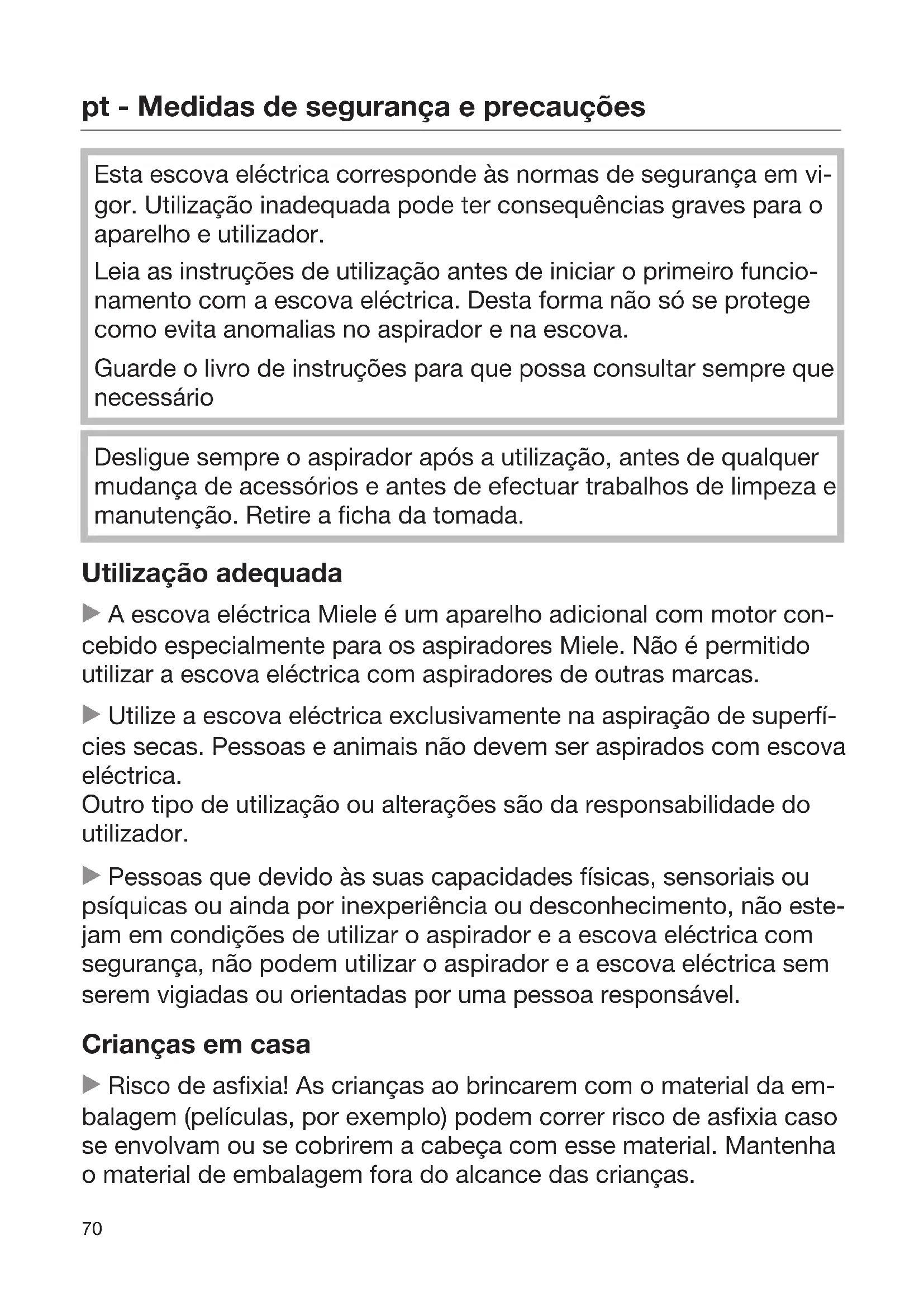 Esta escova eléctrica corresponde às normas de segurança em vi- gor. Utilização inadequada pode ter consequências graves para o aparelho e utilizador. Leia as instruções de utilização antes de iniciar o primeiro funcio- namento com a escova eléctrica. Desta forma não só se protege como evita anomalias no aspirador e na escova. Guarde o livro de instruções para que possa consultar sempre que necessário Desligue sempre o aspirador após a utilização, antes de qualquer mudança de acessórios e antes de efectuar trabalhos de limpeza e manutenção. Retire a ficha da tomada. Utilização adequada A escova eléctrica Miele é um aparelho adicional com motor con- cebido especialmente para os aspiradores Miele. Não é permitido utilizar a escova eléctrica com aspiradores de outras marcas. Utilize a escova eléctrica exclusivamente na aspiração de superfí- cies secas. Pessoas e animais não devem ser aspirados com escova eléctrica. Outro tipo de utilização ou alterações são da responsabilidade do utilizador. Pessoas que devido às suas capacidades físicas, sensoriais ou psíquicas ou ainda por inexperiência ou desconhecimento, não este- jam em condições de utilizar o aspirador e a escova eléctrica com segurança, não podem utilizar o aspirador e a escova eléctrica sem serem vigiadas ou orientadas por uma pessoa responsável. Crianças em casa Risco de asfixia! As crianças ao brincarem com o material da em- balagem (películas, por exemplo) podem correr risco de asfixia caso se envolvam ou se cobrirem a cabeça com esse material. Mantenha o material de embalagem fora do alcance das crianças.pt - Medidas de segurança e precauções
