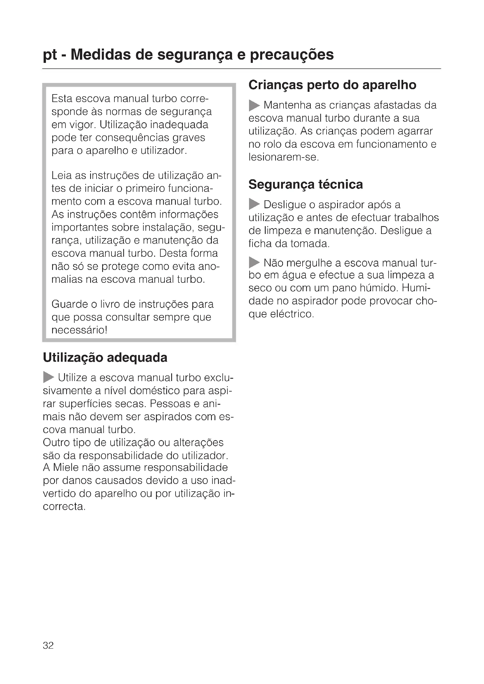 Não mergulhe a escova manual tur- bo em água e efectue a sua limpeza a seco ou com um pano húmido. Humi- dade no aspirador pode provocar cho- que eléctrico. pt - Medidas de segurança e precauções 32Utilização adequada