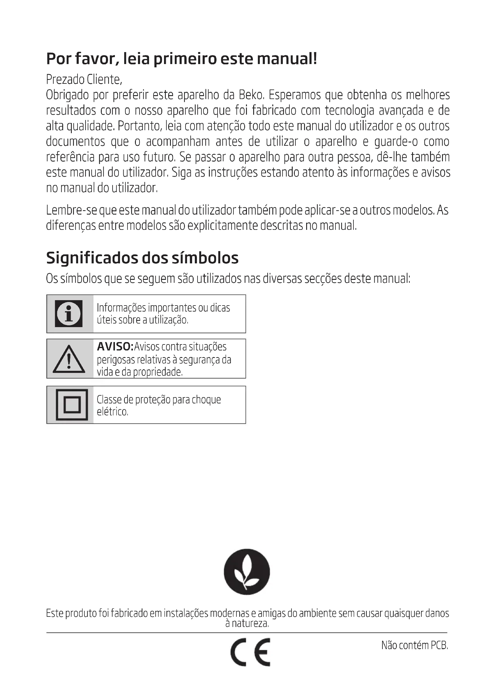 - Het laten vallen van het apparaat kan ervoor zorgen dat het niet meer werkt of permanente schade veroorzaken. 4 Reiniging en onderhoudPor favor, leia primeiro este manual! Prezado Cliente, Obrigado por preferir este aparelho da Beko. Esperamos que obtenha os melhores resultados com o nosso aparelho que foi fabricado com tecnologia avançada e de alta qualidade. Portanto, leia com atenção todo este manual do utilizador e os outros documentos que o acompanham antes de utilizar o aparelho e guarde-o como referência para uso futuro. Se passar o aparelho para outra pessoa, dê-lhe também este manual do utilizador. Siga as instruções estando atento às informações e avisos no manual do utilizador. Lembre-se que este manual do utilizador também pode aplicar-se a outros modelos. As diferenças entre modelos são explicitamente descritas no manual. Significados dos símbolos Os símbolos que se seguem são utilizados nas diversas secções deste manual:
