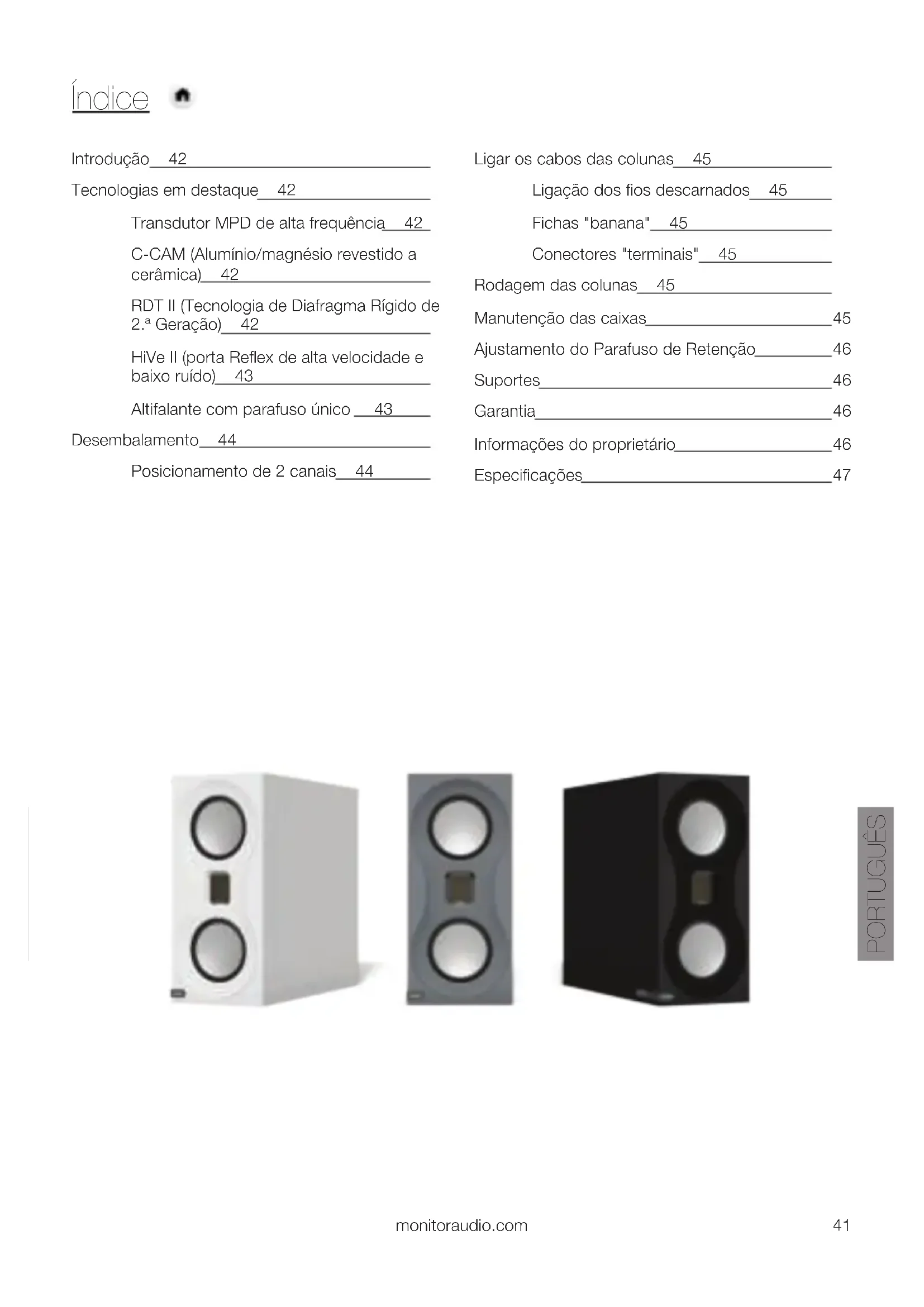 3/8 x 6 1/8 x 141 3/16 pulgadas Peso del producto 7,58 kg (16 lb 9 oz) Acabados disponibles Acabado con laca satinada en negro, blanco y gris Monitor Audio se reserva el derecho a modificar estas especificaciones sin previo aviso. ESPAÑOL monitoraudio.com 39Manual do utilizadorÍndice Introdução 42 Tecnologias em destaque 42 Transdutor MPD de alta frequência 42 C-CAM (Alumínio/magnésio revestido a cerâmica) 42 RDT II (Tecnologia de Diafragma Rígido de 2.ª Geração) 42 HiVe II (porta Reflex de alta velocidade e baixo ruído) 43 Altifalante com parafuso único 43 Desembalamento 44 Posicionamento de 2 canais 44 Ligar os cabos das colunas 45 Ligação dos fios descarnados 45 Fichas "banana" 45 Conectores "terminais" 45 Rodagem das colunas 45 Manutenção das caixas 45 Ajustamento do Parafuso de Retenção 46 Suportes 46 Garantia 46 Informações do proprietário 46 Especificações 47 PORTUGUÊS monitoraudio.com 41Introdução As colunas Studio são um sistema de alto desempenho para entusiastas musicais, que procuram a melhor performance numa solução compacta e com um preço competitivo. O design rigoroso e característico abraça, de forma marcante, a tecnologia de altifalantes, agora mais evoluída e acessível, da série de primeira linha Platinum II. Todos os detalhes da cadeia de sinal foram tidos em conta alcançar a neutralidade - um processo que levou a nossa equipa de design a pensar de forma muito rigorosa. O design sem grelhas, por exemplo, assegura que a coluna apresenta sempre uma performance ótima e sem fazer qualquer concessão. Foram concebidos suportes específicos para a melhor estabilidade possível, com um design que se adequa a todo o conjunto e providencia um desempenho impecável. Tecnologias em destaque Transdutor MPD de alta frequência Foi concebido um transdutor MPD (Micro Pleated Diaphragm) de alta frequência para garantir uma incrível articulação, graças ao diafragma de massa reduzida. O transdutor MPD funciona comprimindo rapidamente as pregas para produzir uma resposta à banda ultrassónica suave, alargada e naturalmente rápida. Como resultado, o som é mais realista, disponibilizando um espectro harmónico abrangente de cada nota, sem a distorção que prejudica a definição do som. C-CAM (Alumínio/magnésio revestido a cerâmica) O material C-CAM é uma liga metálica inovadora, originalmente desenvolvido pela indústria aeroespacial. Exibe qualidades ideais para utilização em cones de colunas, sendo extremamente rígido, porém suficientemente leve para produzir uma alta eficiência geral. O C-CAM é formado a partir de uma liga de alumínio e magnésio, submetida a processos de alívio de tensão, durante o fabrico, para evitar deformação da superfície e fraqueza molecular. Uma camada de cerâmica pura (alumina) é aplicada às superfícies para produzir um exterior completamente rígido. Os cones C-CAM foram concebidos para ter uma elevada resistência ao esforço de flexão. Quando em forma de cone, o material C-CAM fornece uma maior clareza e distorção reduzida, em comparação a materiais de cone convencionais. RDT II (Tecnologia de Diafragma Rígido de 2.ª Geração) O RDT II é uma estrutura em "sanduíche" composta, feita a partir peles de massa reduzida e ultrafinas, interligadas a um material central alveolado - o NomexR. A espessura geral do diafragma RDT II é apenas 2 mm, porém exibe 150 vezes mais resistência do que um cone de coluna convencional. O RDT II é um desenvolvimento único e inovador, criado pelos engenheiros da Monitor Audio para a nova série Platinum