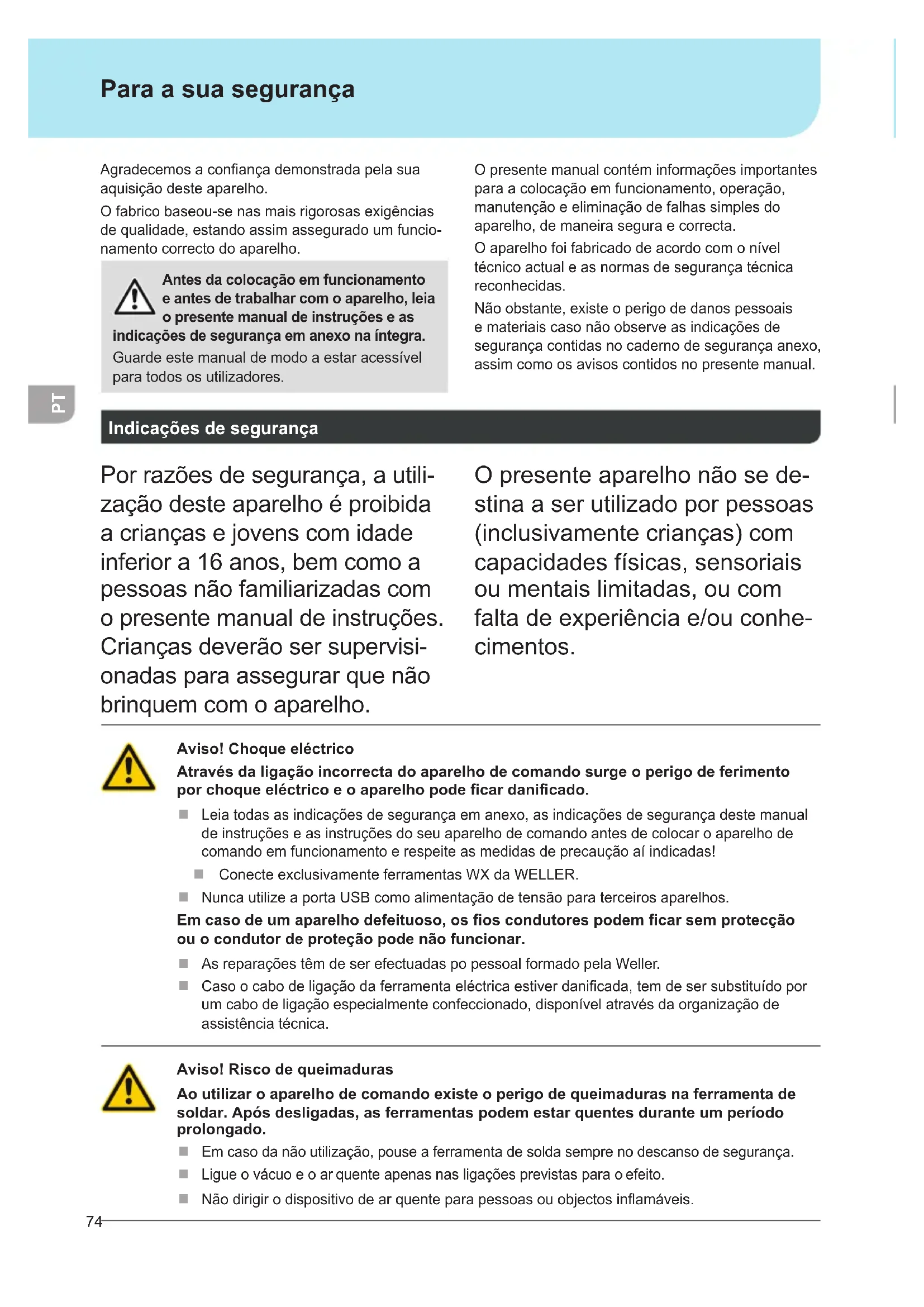 Agradecemos a conança demonstrada pela sua aquisição deste aparelho. O fabrico baseou-se nas mais rigorosas exigências de qualidade, estando assim assegurado um funcio- namento correcto do aparelho. Antes da colocação em funcionamento e antes de trabalhar com o aparelho, leia o presente manual de instruções e as indicações de segurança em anexo na íntegra. Guarde este manual de modo a estar acessível para todos os utilizadores. O presente manual contém informações importantes para a colocação em funcionamento, operação, manutenção e eliminação de falhas simples do aparelho, de maneira segura e correcta. O aparelho foi fabricado de acordo com o nível técnico actual e as normas de segurança técnica reconhecidas. Não obstante, existe o perigo de danos pessoais e materiais caso não observe as indicações de segurança contidas no caderno de segurança anexo, assim como os avisos contidos no presente manual. Indicações de segurança Por razões de segurança, a utili- zação deste aparelho é proibida a crianças e jovens com idade inferior a 16 anos, bem como a pessoas não familiarizadas com o presente manual de instruções. Crianças deverão ser supervisi- onadas para assegurar que não brinquem com o aparelho. O presente aparelho não se de- stina a ser utilizado por pessoas (inclusivamente crianças) com capacidades físicas, sensoriais ou mentais limitadas, ou com falta de experiência e/ou conhe- cimentos. Aviso! Choque eléctrico Através da ligação incorrecta do aparelho de comando surge o perigo de ferimento por choque eléctrico e o aparelho pode car danicado. Leia todas as indicações de segurança em anexo, as indicações de segurança deste manual de instruções e as instruções do seu aparelho de comando antes de colocar o aparelho de comando em funcionamento e respeite as medidas de precaução aí indicadas! Conecte exclusivamente ferramentas WX da WELLER. Nunca utilize a porta USB como alimentação de tensão para terceiros aparelhos. Em caso de um aparelho defeituoso, os os condutores podem car sem protecção ou o condutor de proteção pode não funcionar. As reparações têm de ser efectuadas po pessoal formado pela Weller. Caso o cabo de ligação da ferramenta eléctrica estiver danicada, tem de ser substituído por um cabo de ligação especialmente confeccionado, disponível através da organização de assistência técnica. Aviso! Risco de queimaduras Ao utilizar o aparelho de comando existe o perigo de queimaduras na ferramenta de soldar. Após desligadas, as ferramentas podem estar quentes durante um período prolongado. Em caso da não utilização, pouse a ferramenta de solda sempre no descanso de segurança. Ligue o vácuo e o ar quente apenas nas ligações previstas para o efeito. Não dirigir o dispositivo de ar quente para pessoas ou objectos inamáveis. Para a sua segurança75