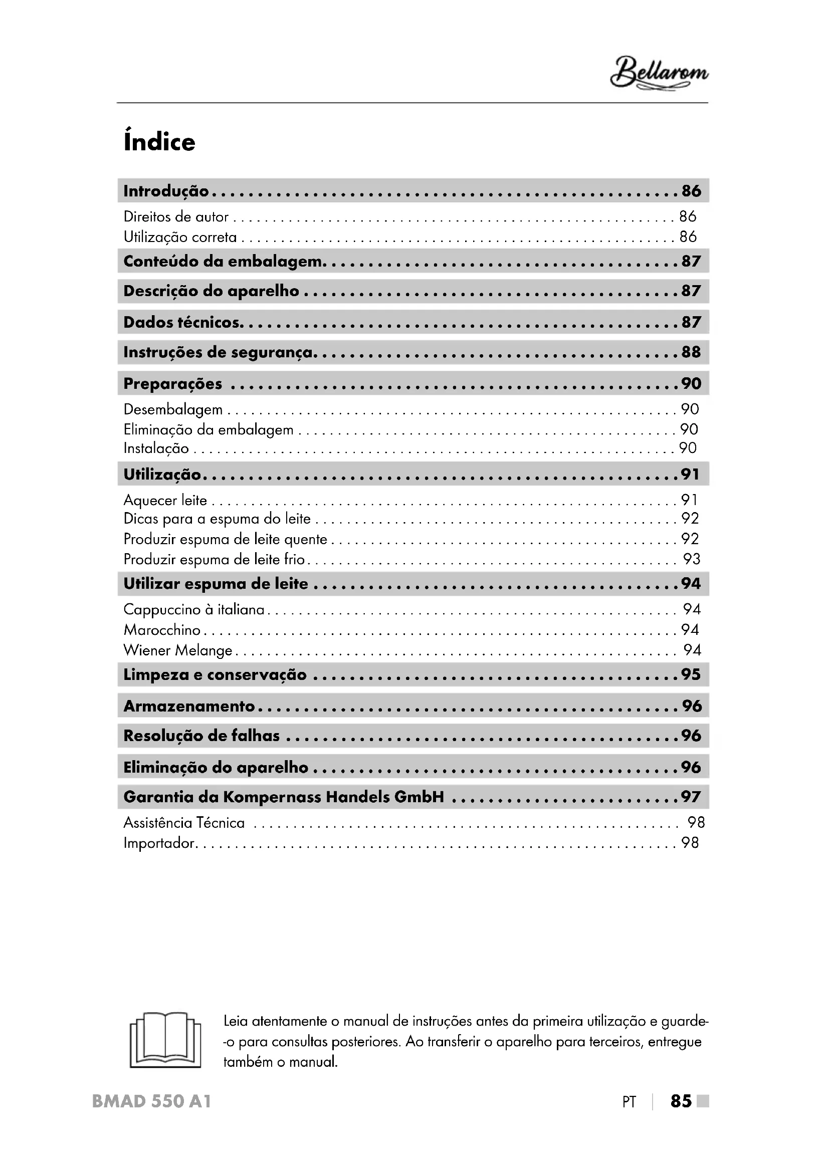 Encontre gratuitamente o manual do aparelho BMAD 550 A1 Bellarom em formato PDF.