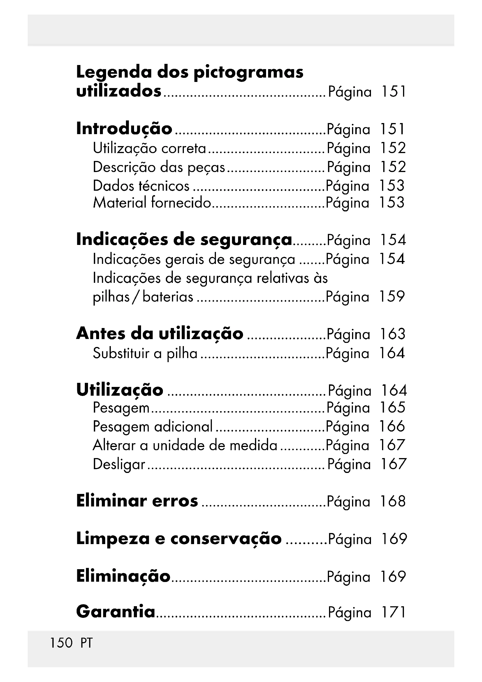 = A pilha está demasiada fraca para a pesagem. Não pode colocar o produto em funcionamento. = Substitua a pilha (ver capítulo “Substituir a pilha“).169 PT Limpeza e conservação Nunca mergulhe o produto em água ou outros líquidos. Caso contrário, o artigo poderá ficar danificado. Limpe a caixa com um pano ligeiramente humedecido e livre de fios. Em caso de maior sujidade, também pode humedecer o pano com um pouco de água morna e sabão. Se armazenar o produto, dobre-o antes. Eliminação A embalagem é feita de materiais não poluentes que podem ser elimi- nados nos contentores de recicla- gem locais. O ponto verde não vale para a Alemanha.