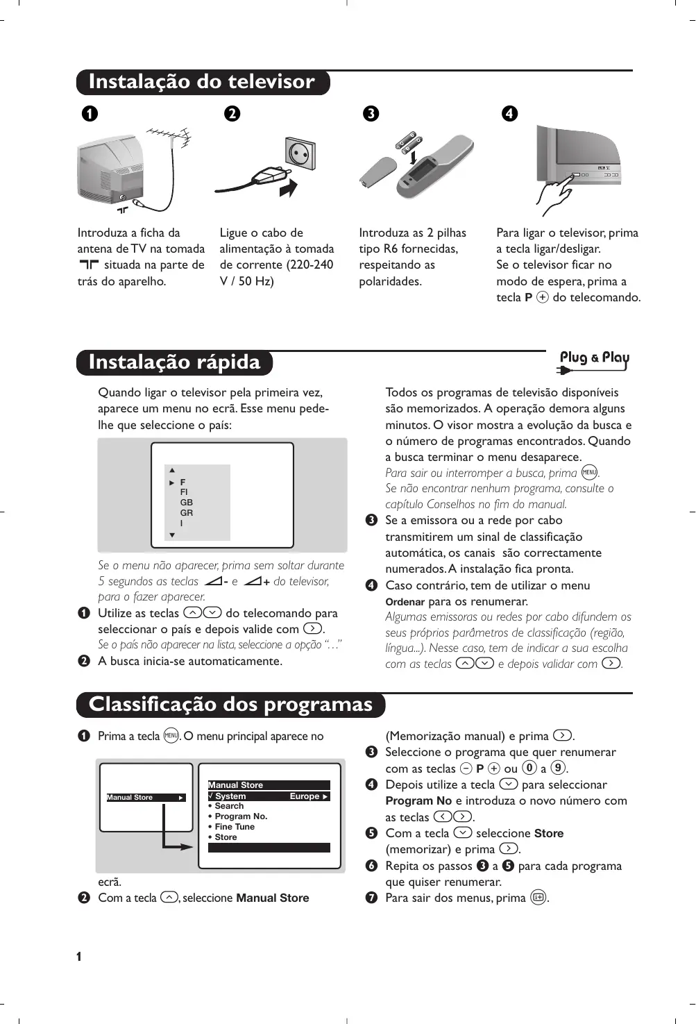 Introduza a ficha da antena de TV na tomada : situada na parte de trás do aparelho. Ligue o cabo de alimentação à tomada de corrente (220-240 V / 50 Hz) Introduza as 2 pilhas tipo R6 fornecidas, respeitando as polaridades. Para ligar o televisor, prima a tecla ligar/desligar. Se o televisor ficar no modo de espera, prima a tecla P # do telecomando. Instalação rápida Quando ligar o televisor pela primeira vez, aparece um menu no ecrã. Esse menu pedelhe que seleccione o país: