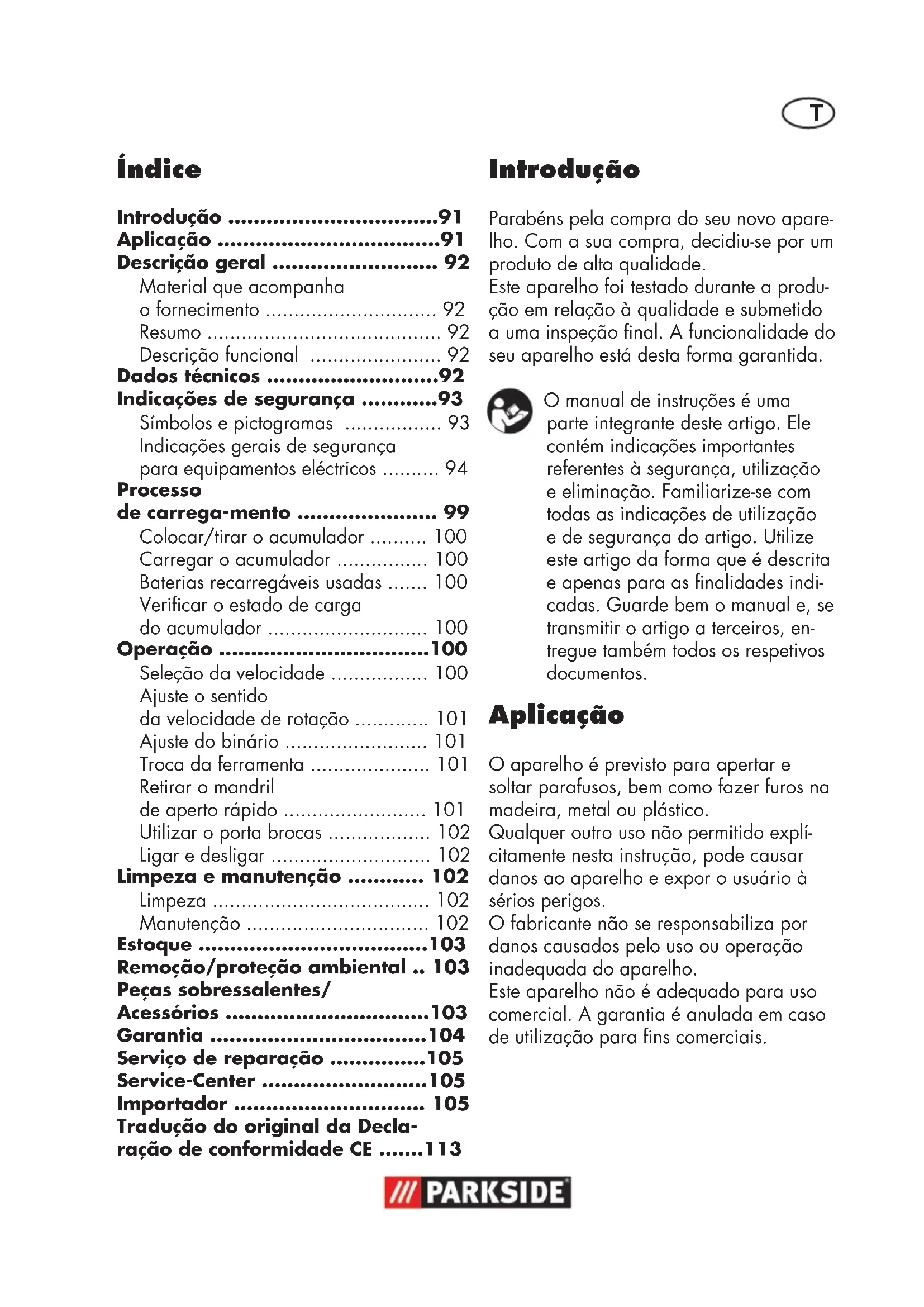 - Indicações de segurança p. 93