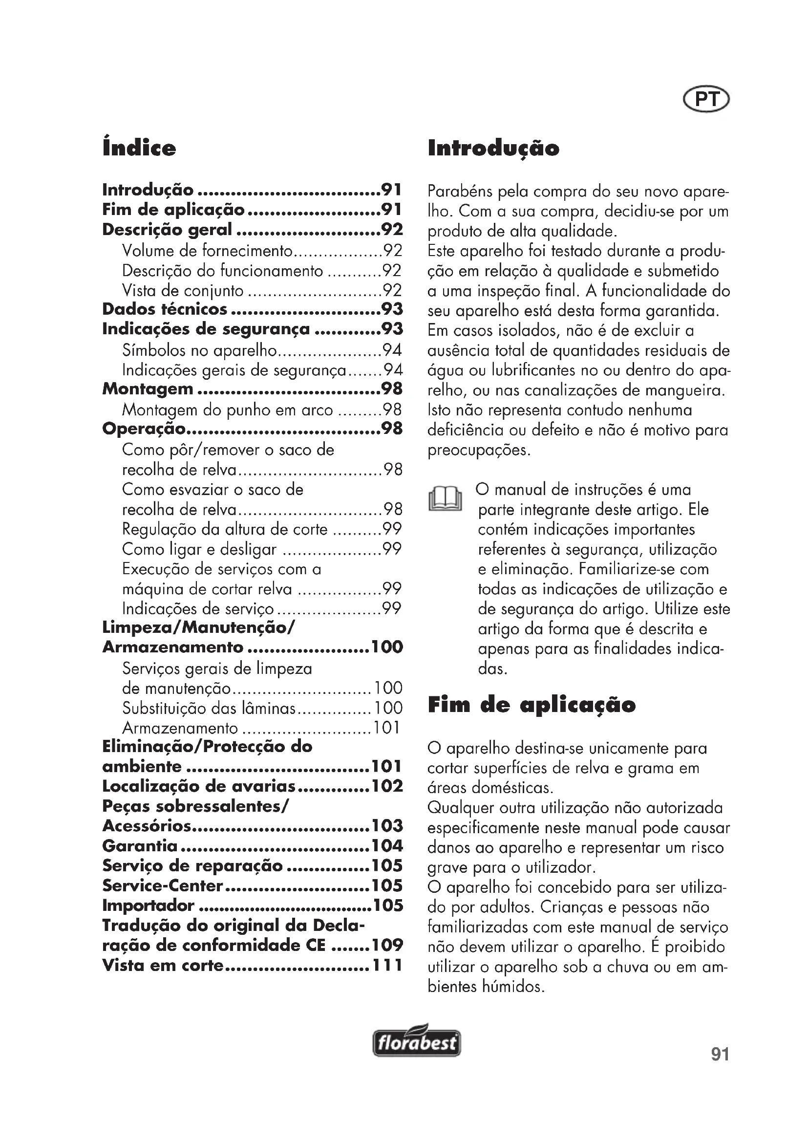 - Introdução Parabéns pela compra do seu novo apare- lho. Com a sua compra, decidiu-se por um produto de alta qualidade. Este aparelho foi testado durante a produ- ção em relação à qualidade e submetido a uma inspeção nal. A funcionalidade do seu aparelho está desta forma garantida. Em casos isolados, não é de excluir a ausência total de quantidades residuais de água ou lubricantes no ou dentro do apa- relho, ou nas canalizações de mangueira. Isto não representa contudo nenhuma deciência ou defeito e não é motivo para preocupações. O manual de instruções é uma parte integrante deste artigo. Ele contém indicações importantes referentes à segurança, utilização e eliminação. Familiarize-se com todas as indicações de utilização e de segurança do artigo. Utilize este artigo da forma que é descrita e apenas para as nalidades indica- das. Fim de aplicação O aparelho destina-se unicamente para cortar superfícies de relva e grama em áreas domésticas. Qualquer outra utilização não autorizada especicamente neste manual pode causar danos ao aparelho e representar um risco grave para o utilizador. O aparelho foi concebido para ser utiliza- do por adultos. Crianças e pessoas não familiarizadas com este manual de serviço não devem utilizar o aparelho. É proibido utilizar o aparelho sob a chuva ou em am- bientes húmidos. Índice Introdução p. 91
