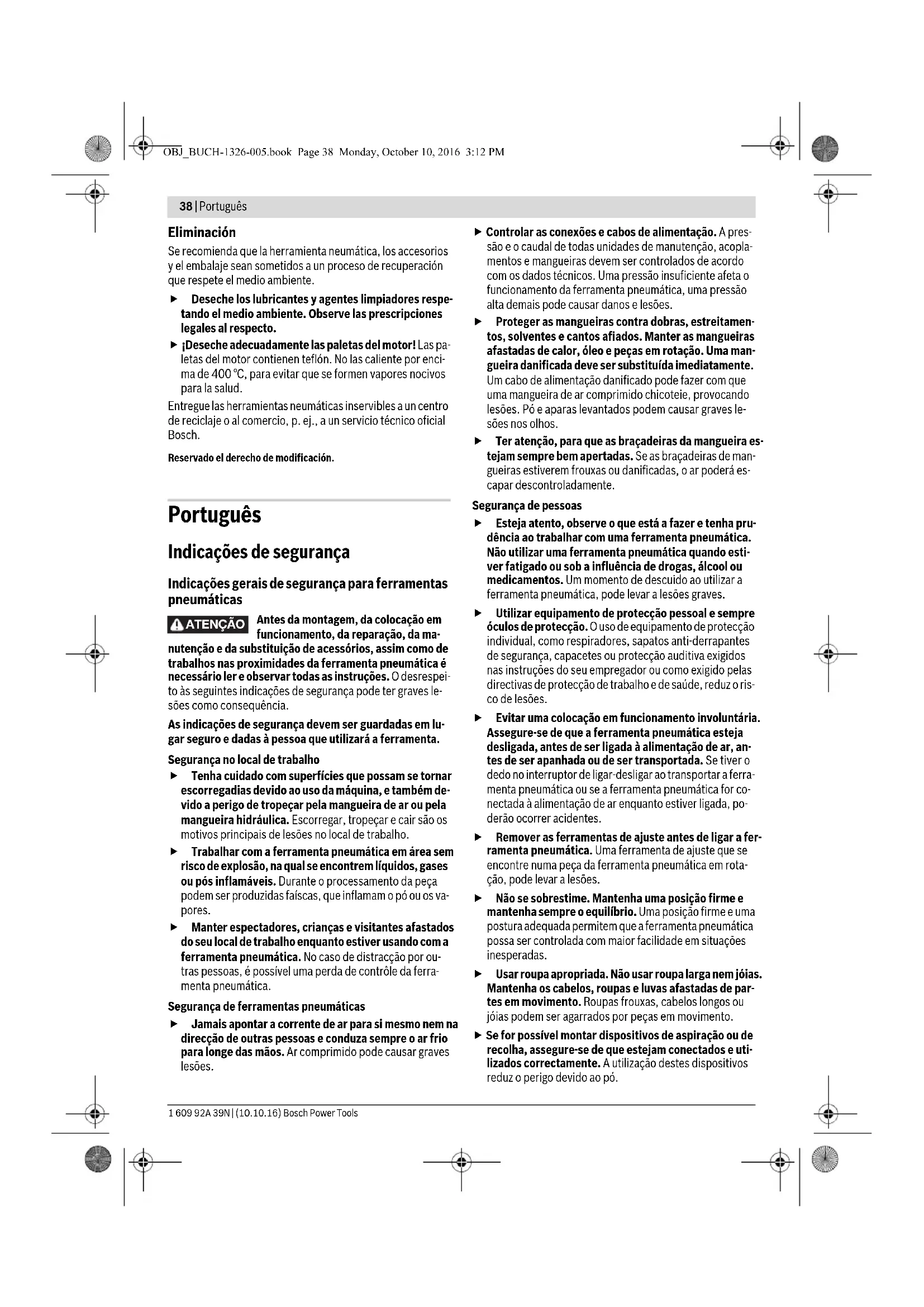 (ver “Datos técnicos”), debería dejar verificar la he- rramienta neumática por un Servicio Postventa Bosch. Con un número de revoluciones en vacío demasiado alto se puede quebrar el útil y con un número de revoluciones de- masiado bajo se reduce el rendimiento de trabajo. Un servicio técnico autorizado Bosch realiza estos trabajos rápida y concienzudamente. Utilice exclusivamente piezas de recambio originales Bosch. Limpieza periódica – Limpie con regularidad el tamiz de la entrada de aire de la herramienta neumática. Para ello, desmonte la boquilla de conexión 4 y elimine las partículas de polvo y suciedad del tamiz. A continuación, vuelva a apretar la boquilla de co- nexión. – La partículas de agua y de suciedad que contiene el aire comprimido fomentan la formación de óxido y el desgaste de las paletas, válvulas, etc. Para evitar esto, introduzca unas cuantas gotas de aceite para motores en la entrada de aire 3. Vuelva a conectar la herramienta neumática a la ali- mentación de aire (ver “Conexión a la toma de aire”, página 34) y déjela funcionar de 5 – 10 s recogiendo en un paño el aceite que sale. Siempre que no tenga previs- to utilizar la herramienta neumática durante un largo tiempo, se recomienda aplicar este procedimiento. Mantenimiento periódico – Después de las primeras 150 horas de servicio limpie el engranaje con un disolvente suave. Siga las instrucciones de uso y eliminación del disolvente que el fabricante reco- mienda. Seguidamente lubrique el engranaje con una gra- sa especial para engranajes Bosch. Después de la primera limpieza, repita las limpiezas siguientes cada 300 horas, procediendo de igual manera. Grasa especial para engranajes (225 ml) Nº de artículo 3 605 430 009 – Las paletas del motor deberán ser inspeccionadas con re- gularidad por un técnico y sustituirse, si procede. Lubricación de herramientas neumáticas que no pertene- cen a la serie CLEAN En todas las herramientas neumáticas Bosch que no perte- nezcan a la serie CLEAN (motor de construcción especial que trabaja con aire comprimido exento de aceite) deberá apor- tarse continuamente una neblina de aceite al aire de entrada. El aceitador requerido para ello se encuentra en la unidad de tratamiento del aire comprimido situada antes antes de la to- ma de la herramienta neumática (para más detalles consulte al fabricante del compresor). Para lubricar directamente la herramienta neumática o para rellenar la unidad de tratamiento deberá emplearse aceite pa- ra motores SAE 10 o SAE 20. Accesorios especiales Información sobre el programa completo de accesorios de ca- lidad la obtiene en internet bajo www.bosch-pt.com o en su comercio especializado habitual. Servicio técnico y atención al cliente Para cualquier consulta o pedido de piezas de repuesto es im- prescindible indicar el nº de artículo de 10 dígitos que figura en la placa de características de la herramienta neumática. El servicio técnico le asesorará en las consultas que pueda Ud. tener sobre la reparación y mantenimiento de su produc- to, así como sobre piezas de recambio. Los dibujos de despie- ce e informaciones sobre las piezas de recambio los podrá ob- tener también en internet bajo: www.bosch-pt.com Nuestro equipo de asesores técnicos le orientará gustosa- mente en cuanto a la adquisición, aplicación y ajuste de los productos y accesorios. España Robert Bosch Espana S.L.U. Departamento de ventas Herramientas Eléctricas C/Hermanos García Noblejas, 19 28037 Madrid Para efectuar su pedido online de recambios o pedir la recogi- da para la reparación de su máquina, entre en la página www.herramientasbosch.net. Tel. Asesoramiento al cliente: 902 531 553 Fax: 902 531554 Venezuela Robert Bosch S.A. Final Calle Vargas. Edf. Centro Berimer P.B. Boleita Norte Caracas 107 Tel.: (0212) 2074511 México Robert Bosch S. de R.L. de C.V. Circuito G. Gonzáles Camarena 333 Centro de Ciudad Santa Fe - 01210 - Mexico DF Tel. Interior: (01) 800 6271286 Tel. D.F.: 52843062 E-Mail: arturo.fernandez@mx.bosch.com Argentina Robert Bosch Argentina S.A. Av. Córdoba 5160 C1414BAW Ciudad Autónoma de Buenos Aires Atención al Cliente Tel.: (0810) 5552020 E-Mail: herramientas.bosch@ar.bosch.com Perú Robert Bosch S.A.C. Av. Primavera 781, Urb. Chacarilla, San Borja (Edificio Aldo) Buzón Postal Lima 41 - Lima Tel.: (01) 2190332 Chile Robert Bosch S.A. Calle El Cacique 0258 Providencia – Santiago Tel.: (02) 2405 5500 OBJ_BUCH-1326-005.book Page 37 Monday, October 10, 2016 3:12 PM38 | Português 1 609 92A 39N | (10.10.16) Bosch Power Tools Eliminación Se recomienda que la herramienta neumática, los accesorios y el embalaje sean sometidos a un proceso de recuperación que respete el medio ambiente. Deseche los lubricantes y agentes limpiadores respe- tando el medio ambiente. Observe las prescripciones legales al respecto. ¡Deseche adecuadamente las paletas del motor! Las pa- letas del motor contienen teflón. No las caliente por enci- ma de 400 °C, para evitar que se formen vapores nocivos para la salud. Entregue las herramientas neumáticas inservibles a un centro de reciclaje o al comercio, p. ej., a un servicio técnico oficial Bosch. Reservado el derecho de modificación. Português Indicações de segurança Indicações gerais de segurança para ferramentas pneumáticas Antes da montagem, da colocação em funcionamento, da reparação, da ma- nutenção e da substituição de acessórios, assim como de trabalhos nas proximidades da ferramenta pneumática é necessário ler e observar todas as instruções. O desrespei- to às seguintes indicações de segurança pode ter graves le- sões como consequência. As indicações de segurança devem ser guardadas em lu- gar seguro e dadas à pessoa que utilizará a ferramenta. Segurança no local de trabalho Tenha cuidado com superfícies que possam se tornar escorregadias devido ao uso da máquina, e também de- vido a perigo de tropeçar 