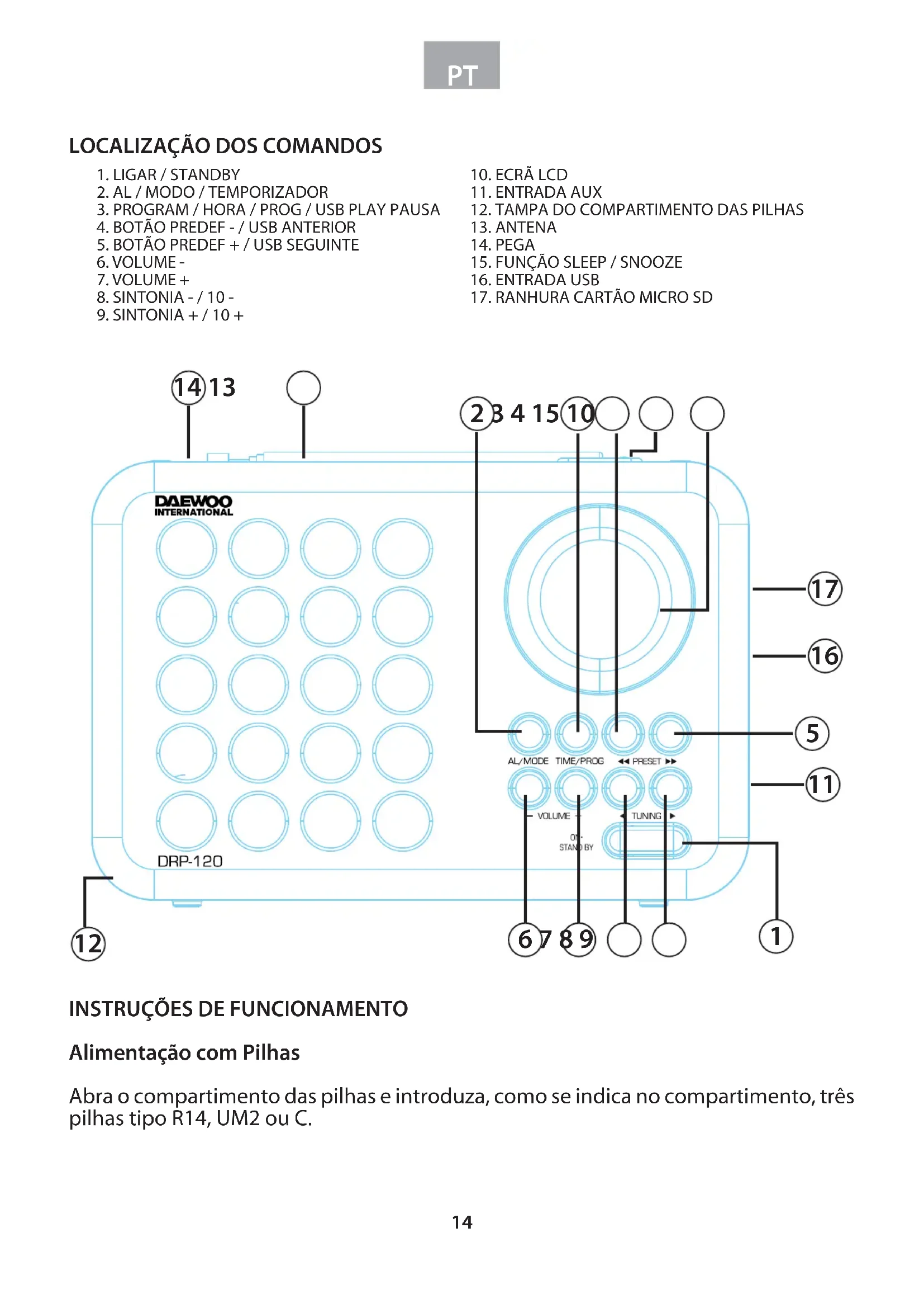 premir HORA/PROG para Pausar/Reproduzir o dispositivo MP3. Se ligar a Unidade USB ou o Cartão MICRO SD incorretamente, poderá dani car o aparelho ou o suporte de memória. Um Cartão MICRO SD bloqueado não pode ser detetado nem reproduzido. PRECAUÇÕES: