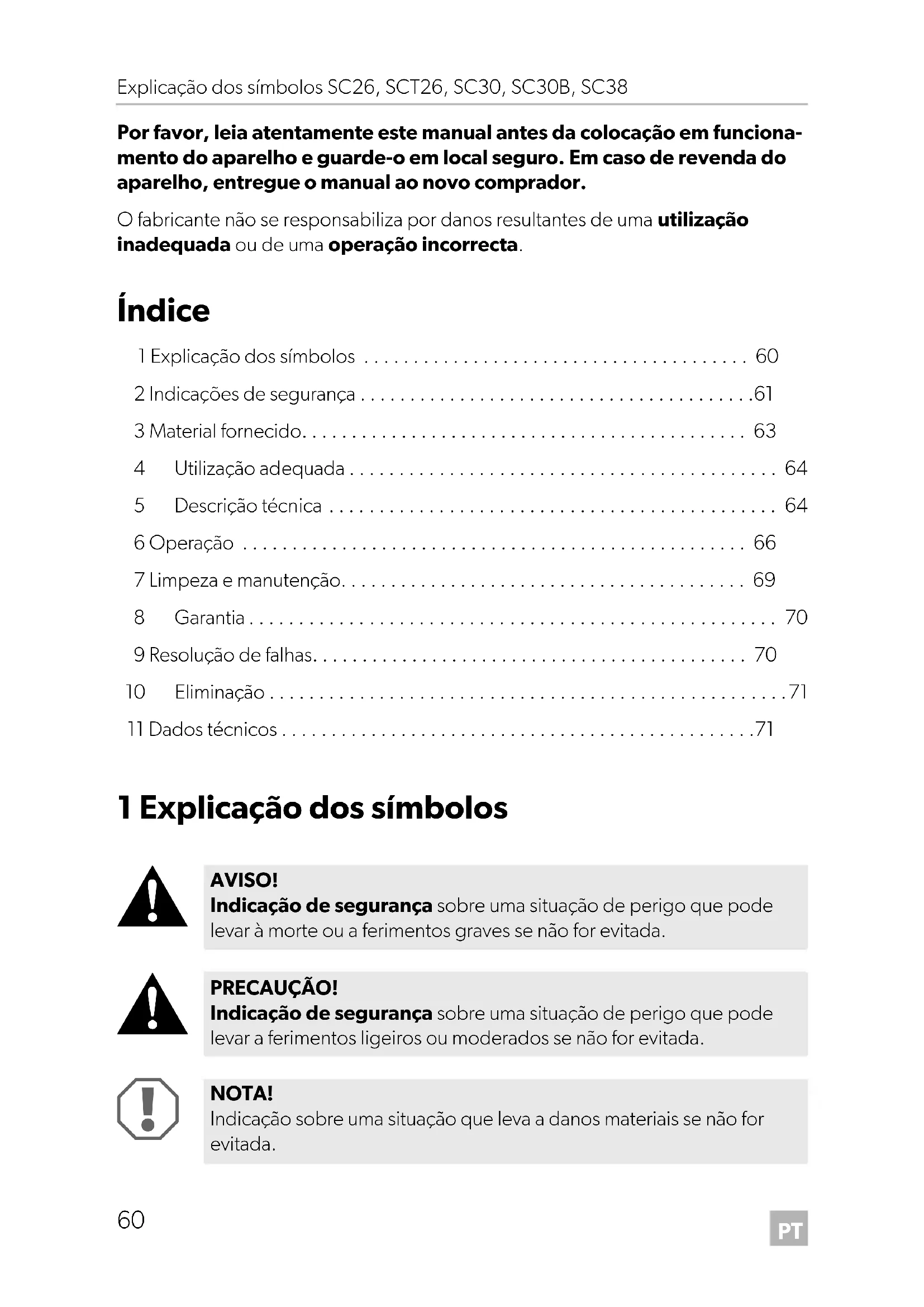 AVISO! Indicação de segurança sobre uma situação de perigo que pode levar à morte ou a ferimentos graves se não for evitada. PRECAUÇÃO! Indicação de segurança sobre uma situação de perigo que pode levar a ferimentos ligeiros ou moderados se não for evitada. NOTA! Indicação sobre uma situação que leva a danos materiais se não for evitada. SC26-SCT26-SC30-SC38_OPM_EMEA16.book Seite 60 Mittwoch, 19. Juni 2019 8:51 20PT SC26, SCT26, SC30, SC30B, SC38 Indicações de segurança