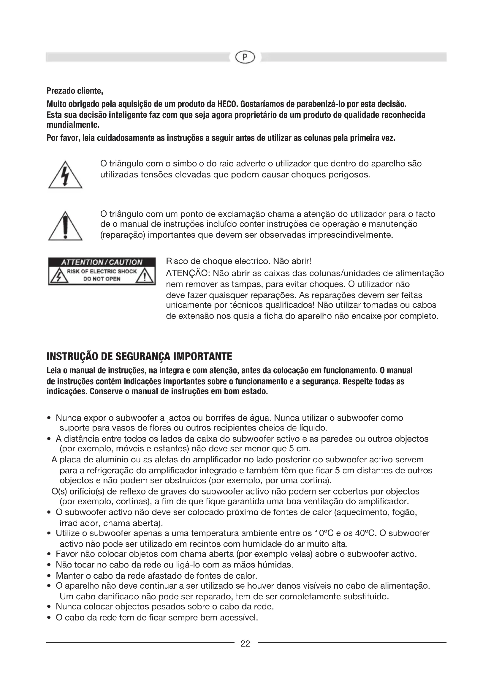 New Phalanx 302A New Phalanx 202A Conguración: Subwoofer activo Subwoofer activo Componentes: 30 cm woofer 30 cm radiador de bajos 20 cm woofer 20 cm radiador de bajos Potencia de salida RMS/Máx.: 250 / 400 vatios 220 / 350 vatios Gama de frecuencias: 18 – 150 Hz 20 – 150 Hz Frecuencia de separación: 50 – 150 Hz regulable 50 – 150 Hz regulable Dimensiones (an x al x pr): 380 x 442 x 435 mm 270 x 285 x 305 mm Accesorios: Cable de la red Cable de la red RESERVADOS LOS DERECHOS DE REALIZAR CAMBIOS TÉCNICOS.22 Prezado cliente, Muito obrigado pela aquisição de um produto da HECO. Gostaríamos de parabenizá-lo por esta decisão. Esta sua decisão inteligente faz com que seja agora proprietário de um produto de qualidade reconhecida mundialmente. Por favor, leia cuidadosamente as instruções a seguir antes de utilizar as colunas pela primeira vez. O triângulo com o símbolo do raio adverte o utilizador que dentro do aparelho são utilizadas tensões elevadas que podem causar choques perigosos. O triângulo com um ponto de exclamação chama a atenção do utilizador para o facto de o manual de instruções incluído conter instruções de operação e manutenção (reparação) importantes que devem ser observadas imprescindivelmente. Risco de choque electrico. Não abrir! ATENÇÃO: Não abrir as caixas das colunas/unidades de alimentação nem remover as tampas, para evitar choques. O utilizador não deve fazer quaisquer reparações. As reparações devem ser feitas unicamente por técnicos qualicados! Não utilizar tomadas ou cabos de extensão nos quais a cha do aparelho não encaixe por completo.