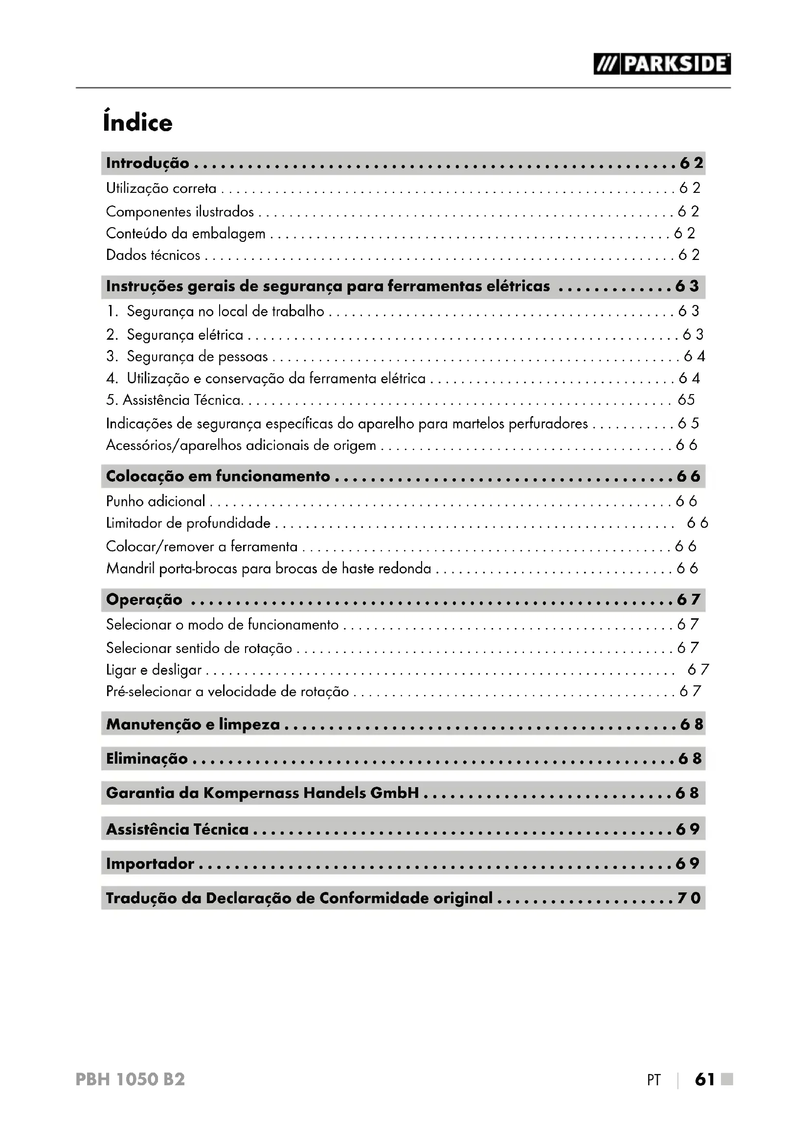 - Tradução da Declaração de Conformidade original PBH 1050 B2 ■ 62 │ PT p. 70