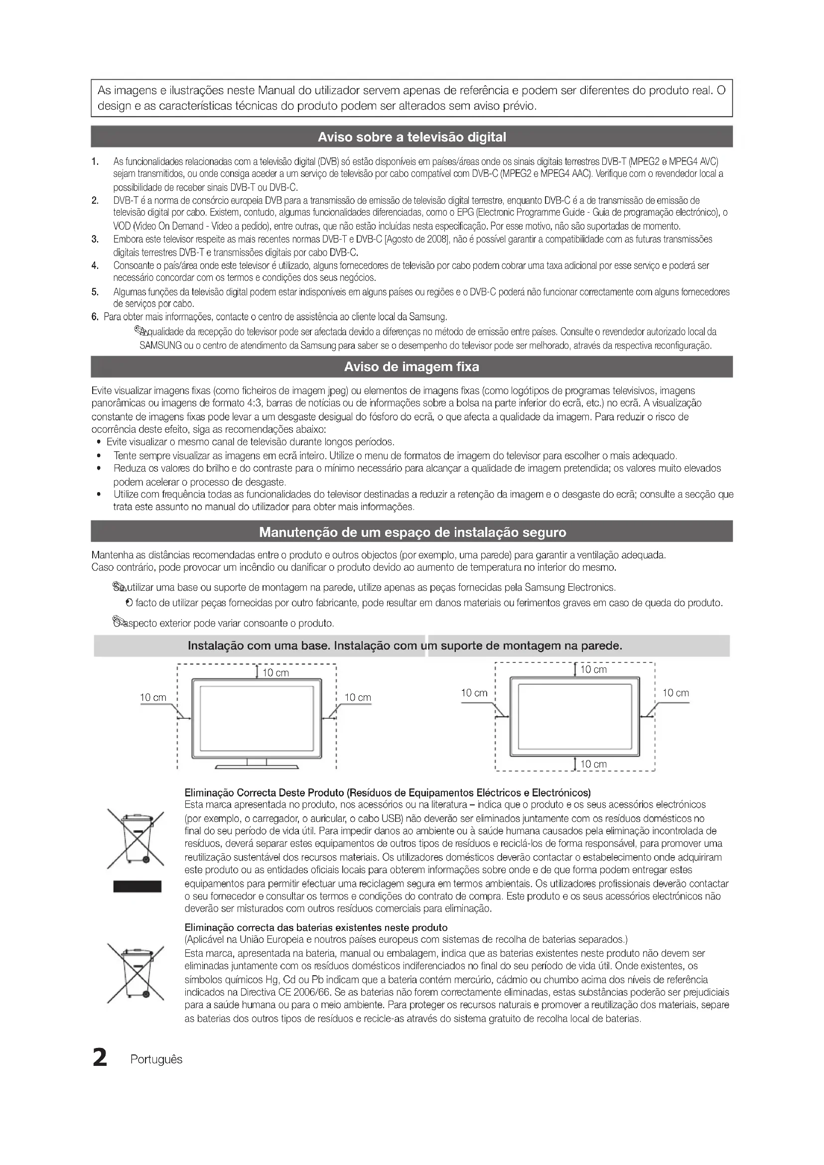 O aspecto exterior pode variar consoante o produto. Instalação com uma base. Instalação com um suporte de montagem na parede. 10 cm 10 cm 10 cm 10 cm 10 cm 10 cm 10 cm Eliminação Correcta Deste Produto (Resíduos de Equipamentos Eléctricos e Electrónicos) Esta marca apresentada no produto, nos acessórios ou na literatura – indica que o produto e os seus acessórios electrónicos (por exemplo, o carregador, o auricular, o cabo USB) não deverão ser eliminados juntamente com os resíduos domésticos no final do seu período de vida útil. Para impedir danos ao ambiente ou à saúde humana causados pela eliminação incontrolada de resíduos, deverá separar estes equipamentos de outros tipos de resíduos e reciclá-los de forma responsável, para promover uma reutilização sustentável dos recursos materiais. Os utilizadores domésticos deverão contactar o estabelecimento onde adquiriram este produto ou as entidades oficiais locais para obterem informações sobre onde e de que forma podem entregar estes equipamentos para permitir efectuar uma reciclagem segura em termos ambientais. Os utilizadores profissionais deverão contactar o seu fornecedor e consultar os termos e condições do contrato de compra. Este produto e os seus acessórios electrónicos não deverão ser misturados com outros resíduos comerciais para eliminação. Eliminação correcta das baterias existentes neste produto (Aplicável na União Europeia e noutros países europeus com sistemas de recolha de baterias separados.) Esta marca, apresentada na bateria, manual ou embalagem, indica que as baterias existentes neste produto não devem ser eliminadas juntamente com os resíduos domésticos indiferenciados no final do seu período de vida útil. Onde existentes, os símbolos químicos Hg, Cd ou Pb indicam que a bateria contém mercúrio, cádmio ou chumbo acima dos níveis de referência indicados na Directiva CE 2006/66. Se as baterias não forem correctamente eliminadas, estas substâncias poderão ser prejudiciais para a saúde humana ou para o meio ambiente. Para proteger os recursos naturais e promover a reutilização dos materiais, separe as baterias dos outros tipos de resíduos e recicle-as através do sistema gratuito de recolha local de baterias. [UC8000_XC]BN68-02697L-01L06.indb 2 2010-08-13 오후 3:24:283 PORTUGUÊS Português Índice Introdução