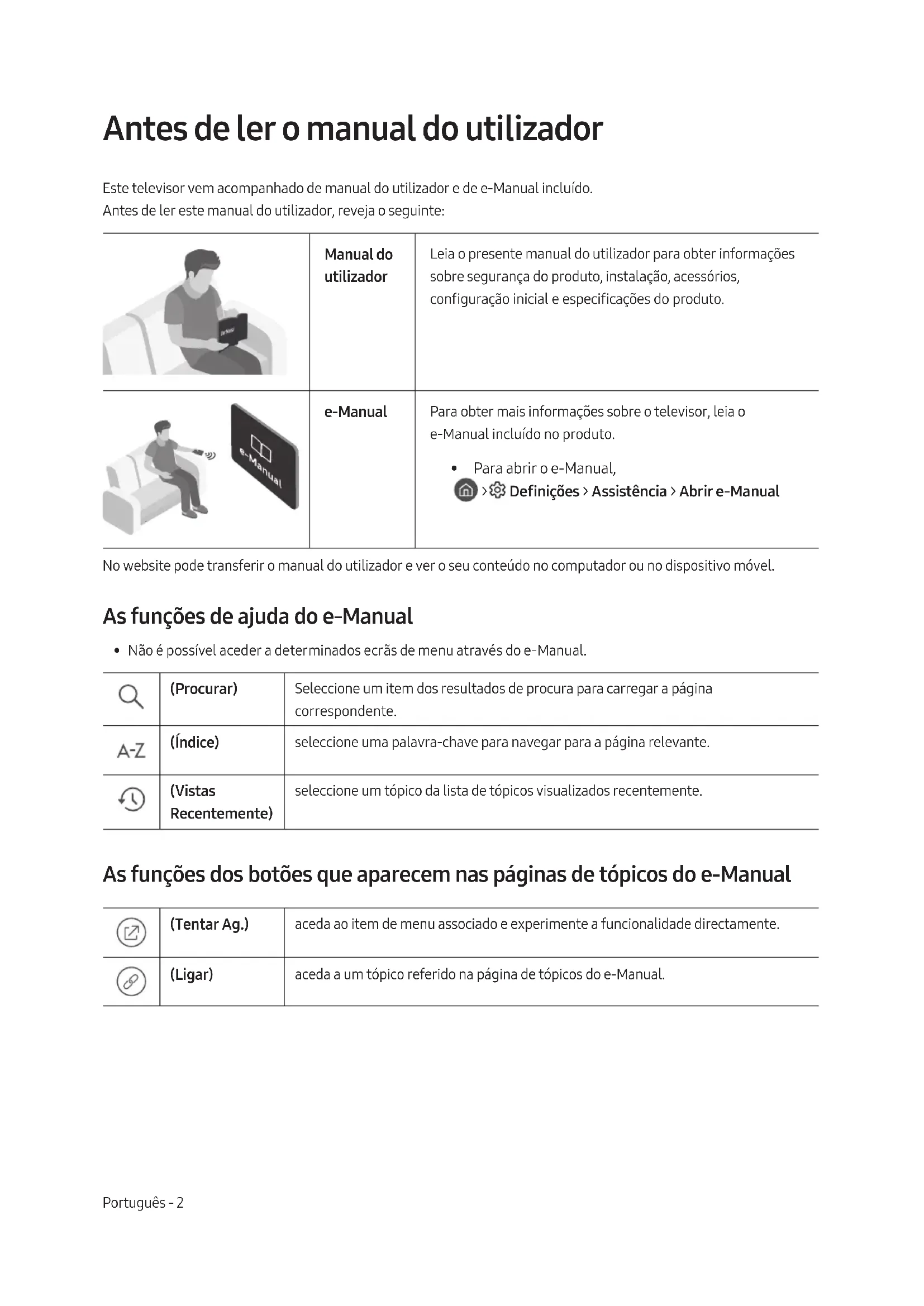 - Para abrir o e-Manual, > Denições > Assistência > Abrir e-Manual No website pode transferir o manual do utilizador e ver o seu conteúdo no computador ou no dispositivo móvel. As funções de ajuda do e-Manual