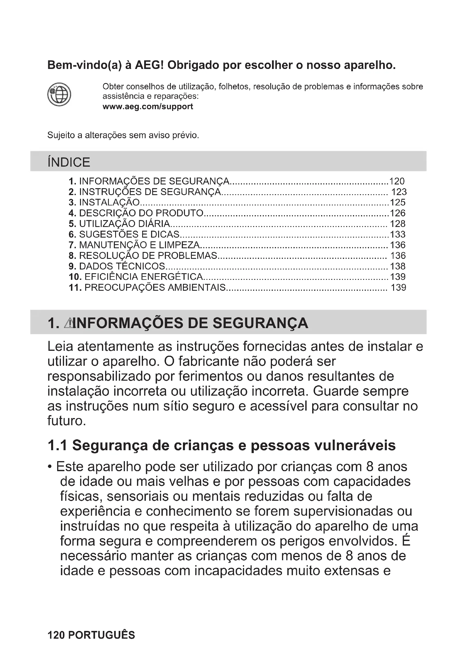 - Este aparelho pode ser utilizado por crianças com 8 anos de idade ou mais velhas e por pessoas com capacidades físicas, sensoriais ou mentais reduzidas ou falta de experiência e conhecimento se forem supervisionadas ou instruídas no que respeita à utilização do aparelho de uma forma segura e compreenderem os perigos envolvidos. É necessário manter as crianças com menos de 8 anos de idade e pessoas com incapacidades muito extensas e 120 PORTUGUÊScomplexas afastadas do aparelho, a menos que sejam constantemente vigiadas.