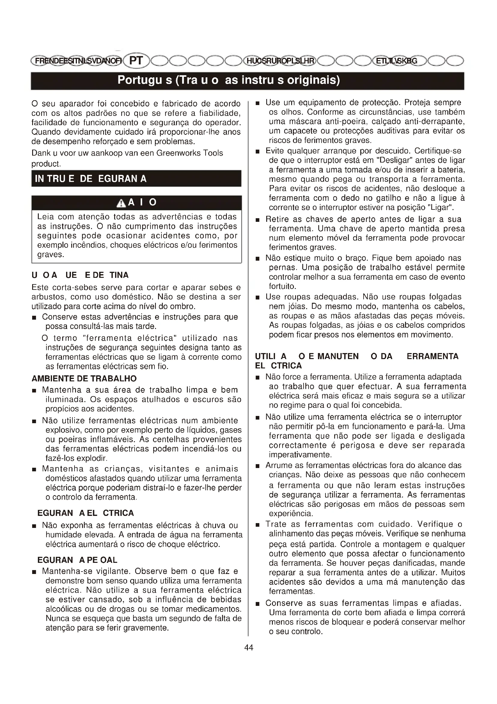 - Faça pausas frequentes no trabalho. Limite o tempo de exposição por dia. Caso sinta algum dos sintomas desta doença, interrompa de imediato a sua utilização e consulte o seu médico sobre estes sintomas. INSTRUÇÕES DURANTE A UTILIZAÇÃO DO CORTA-SEBES ■ Não utilize o corta-sebes se a pega dianteira não estiver no sítio. Mantenha a ferramenta com as duas mãos quando a utiliza. ■ Para evitar os riscos de arranque por descuido, não desloque a ferramenta com o dedo no gatilho. ■ Mantenha-se vigilante. Veja bem o que está a fazer e use o seu bom senso. ■ Use calças espessas, calçado de segurança anti- derrapante e luvas. Não use calções nem sandálias e não utilize o corta-sebes se estiver descalço. ■ Não utilize esta ferramenta numa zona mal iluminada. O seu espaço de trabalho deve estar bem iluminado (luz do dia ou luz artificial). ■ Pense em manter sempre o equilíbrio e não utilize a ferramenta sobre um suporte instável. Fique sempre bem apoiado nas pernas e não estique demasiado o braço. Não utilize a sua ferramenta em cima de uma escada. ■ Não force a ferramenta. A sua ferramenta será mais eficaz e mais segura se a utilizar no regime para o qual foi concebida. ■ Solte o gatilho, espere que o motor pare totalmente e retire a bateria antes de limpar, reparar ou fazer ajustes na sua ferramenta. ■ Este corta-sebes serve somente para cortar sebes, maciços e arbustos. Não utilize esta ferramenta para outros fins. ■ Antes de pôr a ferramenta e trabalhar, verifique se a lâmina não vai encontrar obstáculos. ■ Se o corta-sebes chocar contra um obstáculo ou se um objecto ficar preso na lâmina, pare imediatamente a ferramenta, retire a bateria e verifique se nenhuma peça ficou danificada. Não utilize a ferramenta antes de ter efectuado as reparações necessárias. Não utilize a ferramenta se as peças não estiverem correctamente fixadas ou se estiverem danificadas. ■ Observe bem o que está a fazer. Fie-se no seu bom senso. ■ Trate o corta-sebes com cuidado. Verifique se a lâmina está limpa e bem afiada para que o corta- sebes seja eficiente e possa ser utilizado com toda a segurança. Lubrifique o mude os acessórios segundo as instruções. Mantenha as pegas sempre secas, limpas e sem nenhum resto de óleo nem de massa.47 Portugues (Tradução das instruções originais)