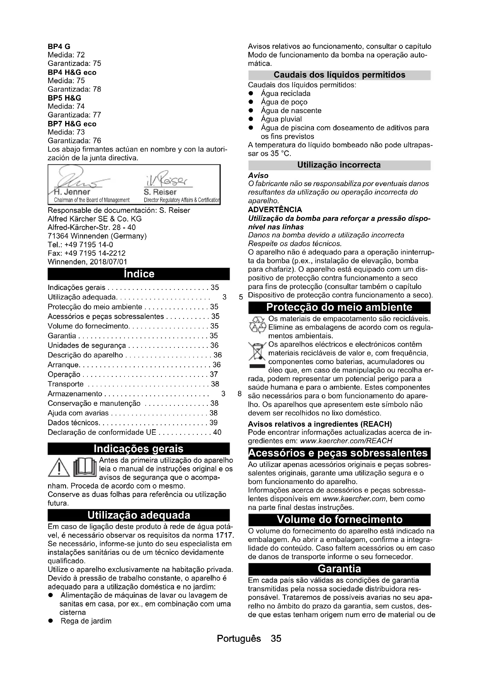 • dB(A) 61 63 61 61 dB(A) 76 78 77 76Português 35 BP4 G Medida: 72 Garantizada: 75 BP4 H&G eco Medida: 75 Garantizada: 78 BP5 H&G Medida: 74 Garantizada: 77 BP7 H&G eco Medida: 73 Garantizada: 76 Los abajo firmantes actúan en nombre y con la autori- zación de la junta directiva. Responsable de documentación: S. Reiser Alfred Kärcher SE & Co. KG Alfred-Kärcher-Str. 28 - 40 71364 Winnenden (Germany) Tel.: +49 7195 14-0 Fax: +49 7195 14-2212 Winnenden, 2018/07/01 Índice Indicações gerais Antes da primeira utilização do aparelho leia o manual de instruções original e os avisos de segurança que o acompa- nham. Proceda de acordo com o mesmo. Conserve as duas folhas para referência ou utilização futura. Utilização adequada Em caso de ligação deste produto à rede de água potá- vel, é necessário observar os requisitos da norma 1717. Se necessário, informe-se junto do seu especialista em instalações sanitárias ou de um técnico devidamente qualificado. Utilize o aparelho exclusivamente na habitação privada. Devido à pressão de trabalho constante, o aparelho é adequado para a utilização doméstica e no jardim: Alimentação de máquinas de lavar ou lavagem de sanitas em casa, por ex., em combinação com uma cisterna Rega de jardim Avisos relativos ao funcionamento, consultar o capítulo Modo de funcionamento da bomba na operação auto- mática. Caudais dos líquidos permitidos Caudais dos líquidos permitidos: Água reciclada Água de poço Água de nascente Água pluvial Água de piscina com doseamento de aditivos para os fins previstos A temperatura do líquido bombeado não pode ultrapas- sar os 35 °C. Utilização incorrecta Aviso O fabricante não se responsabiliza por eventuais danos resultantes da utilização ou operação incorrecta do aparelho. ADVERTÊNCIA Utilização da bomba para reforçar a pressão dispo- nível nas linhas Danos na bomba devido a utilização incorrecta Respeite os dados técnicos. O aparelho não é adequado para a operação ininterrup- ta da bomba (p.ex., instalação de elevação, bomba para chafariz). O aparelho está equipado com um dis- positivo de protecção contra funcionamento a seco para fins de protecção (consultar também o capítulo Dispositivo de protecção contra funcionamento a seco). Protecção do meio ambiente Os materiais de empacotamento são recicláveis. Elimine as embalagens de acordo com os regula- mentos ambientais. Os aparelhos eléctricos e electrónicos contêm materiais recicláveis de valor e, com frequência, componentes como baterias, acumuladores ou óleo que, em caso de manipulação ou recolha er- rada, podem representar um potencial perigo para a saúde humana e para o ambiente. Estes componentes são necessários para o bom funcionamento do apare- lho. Os aparelhos que apresentem este símbolo não devem ser recolhidos no lixo doméstico. Avisos relativos a ingredientes (REACH) Pode encontrar informações actualizadas acerca de in- gredientes em: www.kaercher.com/REACH Acessórios e peças sobressalentes Ao utilizar apenas acessórios originais e peças sobres- salentes originais, garante uma utilização segura e o bom funcionamento do aparelho. Informações acerca de acessórios e peças sobressa- lentes disponíveis em www.kaercher.com, bem como na parte final destas instruções. Volume do fornecimento O volume do fornecimento do aparelho está indicado na embalagem. Ao abrir a embalagem, confirme a integra- lidade do conteúdo. Caso faltem acessórios ou em caso de danos de transporte informe o seu fornecedor. Garantia Em cada país são válidas as condições de garantia transmitidas pela nossa sociedade distribuidora res- ponsável. Trataremos de possíveis avarias no seu apa- relho no âmbito do prazo da garantia, sem custos, des- de que estas tenham origem num erro de material ou de Indicações gerais p. 35