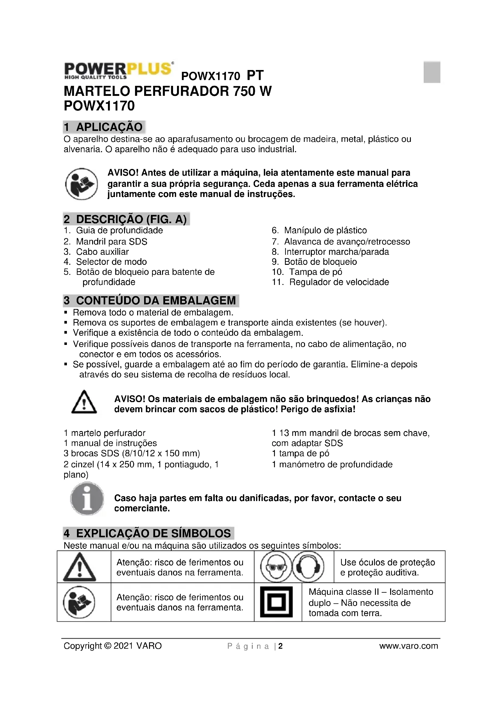 Máquina classe II – Isolamento duplo – Não necessita de tomada com terra.POWX1170 PT Copyright © 2021 VARO P á g i n a | 3 www.varo.com