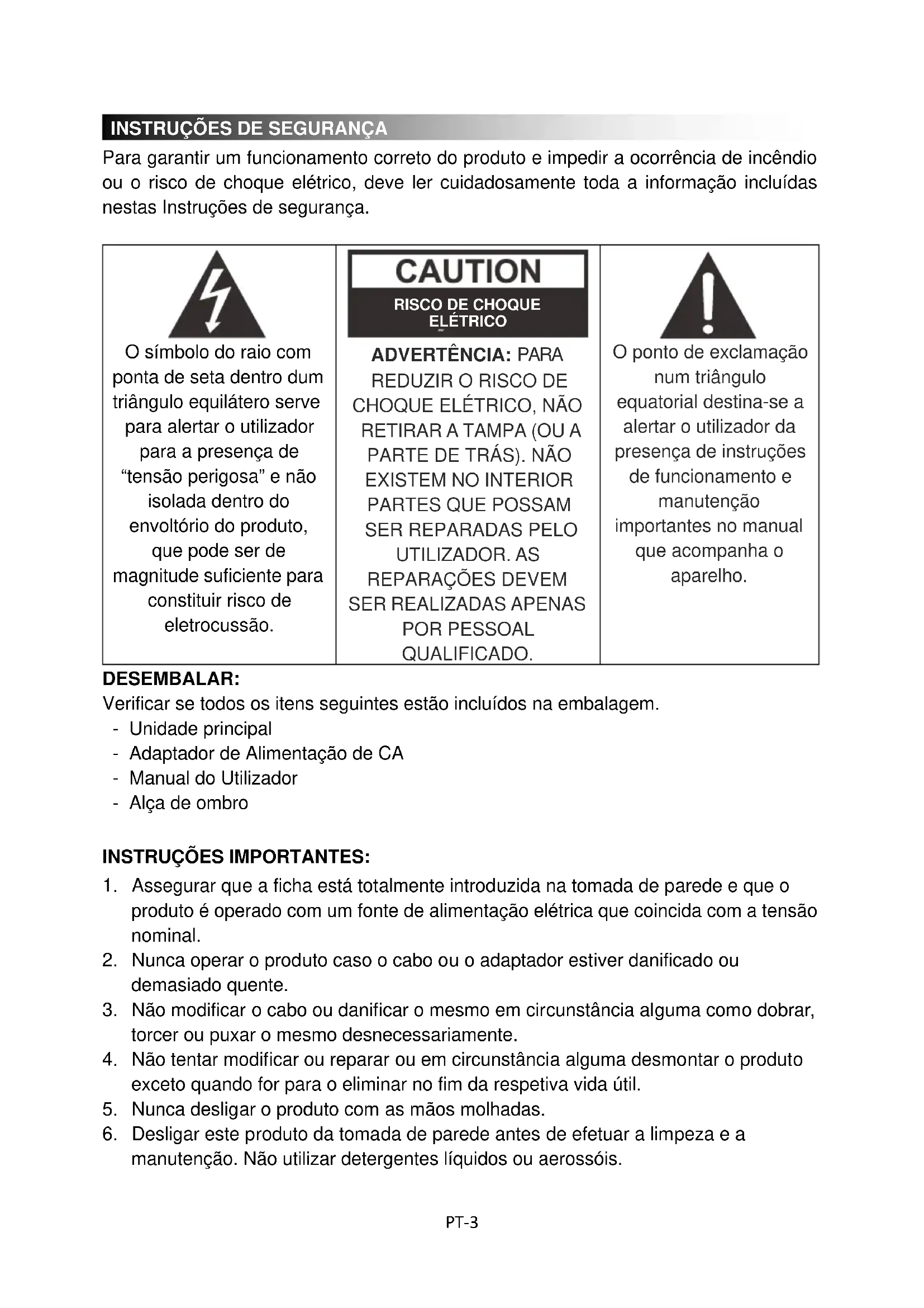 Para garantir um funcionamento correto do produto e impedir a ocorrência de incêndio ou o risco de choque elétrico, deve ler cuidadosamente toda a informação incluídas nestas Instruções de segurança.