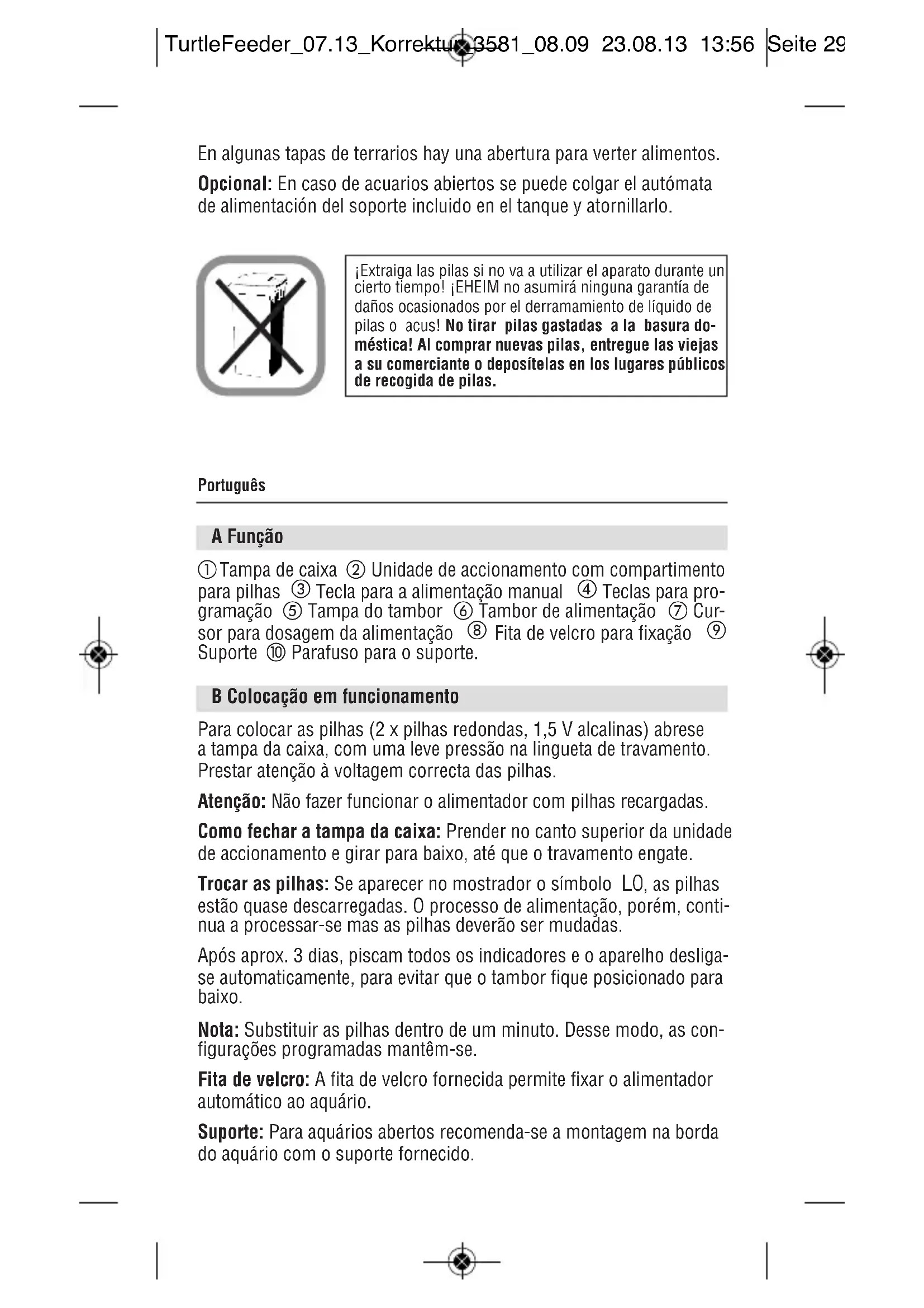 = A alimentação é distribuída duas vezes com um intervalo de um minuto. SET > Memoriza-se a alimentação. MODE > Aparece o próximo horário de alimentação. Este pode ser programado com SET, como descrito acima, ou pode-se voltar à hora actual passando-se pelos demais horários de alimentação, premindo-se repetidamente MODE. TurtleFeeder_07.13_Korrektur_3581_08.09 23.08.13 13:56 Seite 30D Operação manual Para alimentações fora das horas programadas, é suficiente pressio- nar na tecla situada na parte de cima do mostrador, com o que pode ser libertado manualmente o giro do tambor. E Enchimento Retirar a unidade do tambor na direcção do comprimento e tirar a tam- pa de trás. Limpar o tambor a seco (pincel) e encher com alimento. Em seguida, recolocar a tampa e introduzir a unidade do tambor no eixo. O alimentador automático adequa-se para caranguejos de de água doce, camarão boreal, alimentos em stick ou granulados. Não utilizar para alimentos frescos ou húmidos! F Quantidade de alimento Com a regulação do cursor pode-se variar a abertura do tambor, para dosear a quantidade de alimento conforme desejado. Para quantidades maiores, pode programar-se uma dupla distribuição. G Posicionamento Colocar o alimentador automático na tampa do aquário, de forma que a quantidade do alimento possa cair livremente na superfície da água. A parte do accionamento com a abertura traseira para sucção do ar não deve encontrar-se na área do ar húmido do aquário aberto. Não obstruir a abertura de sucção do ar. Em algumas coberturas de terrários já está prevista a respectiva abertura de alimentação. Opção: Nos aquários abertos, basta colocar e aparafusar o alimenta- dor automático na borda do aquário com o suporte fornecido. Se as pilhas não forem usadas por um período de tempo elevado retire-as! EHEIM não fornece qualquer garantia por danos causados por derrames de pilhas ou baterias de acumuladores! Não deita as pilhas gastas para o lixo normal! Entre- gue as pilhas ao vendedor ao comprar novas ou entre- gue-as nos postos de recolha de lixo especial. Eλληνικά