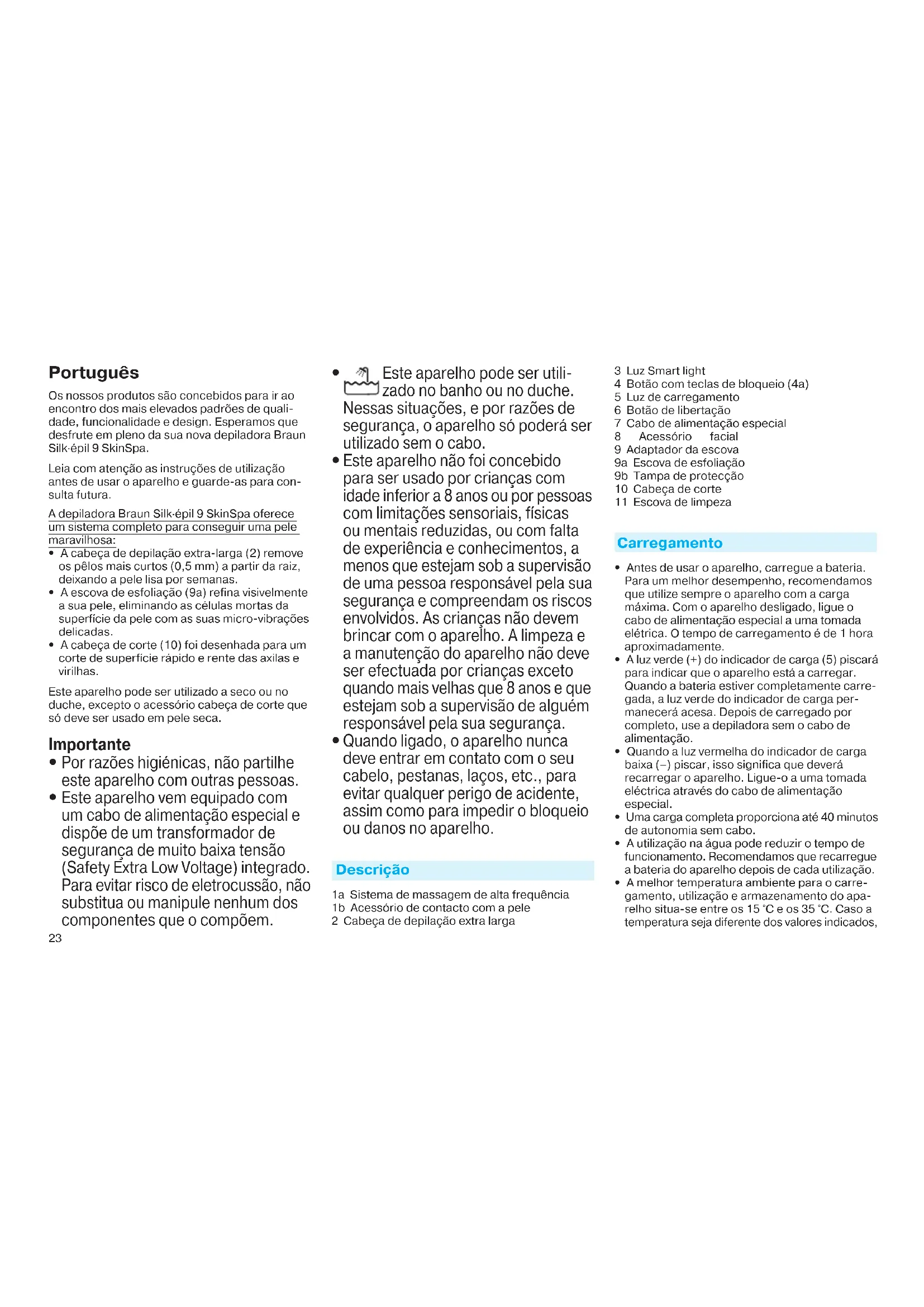 Quando ligado, o aparelho nunca deve entrar em contato com o seu cabelo, pestanas, laços, etc., para evitar qualquer perigo de acidente, assim como para impedir o bloqueio ou danos no aparelho. Descrição 1a Sistema de massagem de alta frequência 1b Acessório de contacto com a pele 2 Cabeça de depilação extra larga 3 Luz Smart light 4 Botão com teclas de bloqueio (4a) 5 Luz de carregamento 6 Botão de libertação 7 Cabo de alimentação especial 8 Acessório facial 9 Adaptador da escova 9a Escova de esfoliação 9b Tampa de protecção 10 Cabeça de corte 11 Escova de limpeza Carregamento