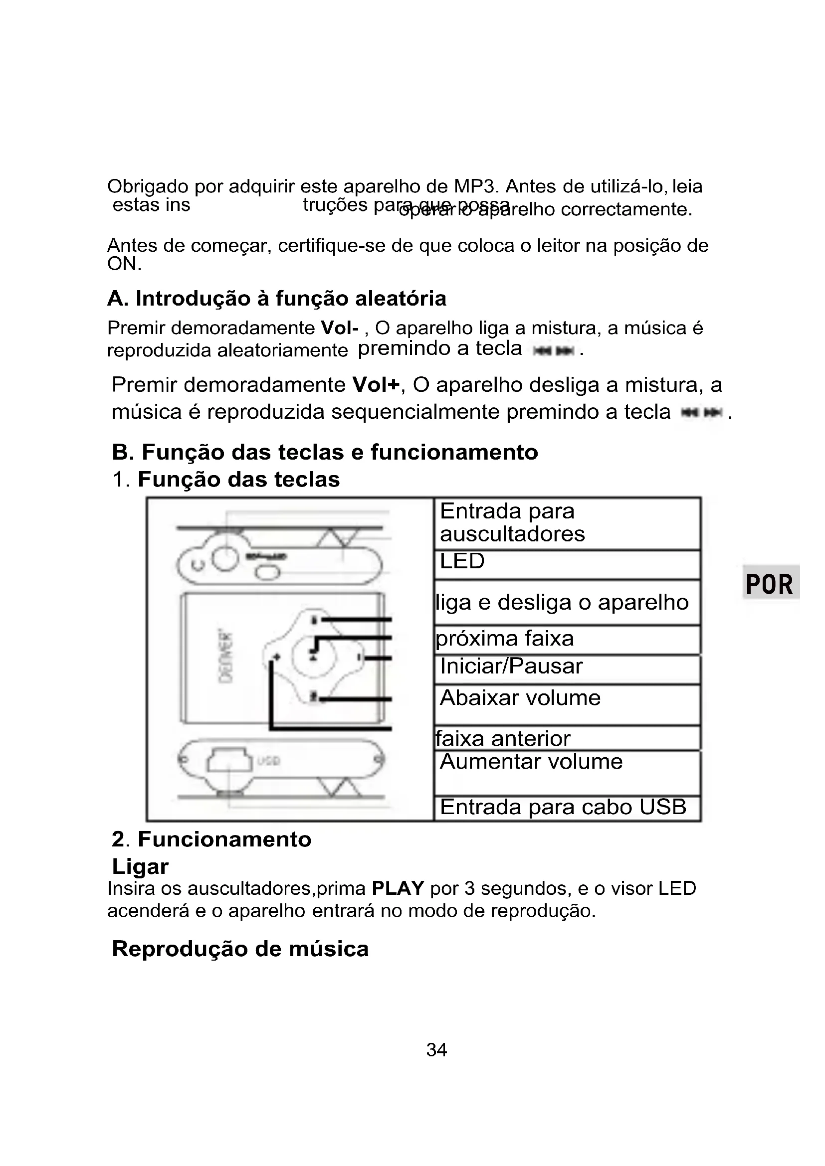 Insira os auscultadores, prima PLAY por 3 segundos, e o visor LED acenderá e o aparelho entrará no modo de reprodução.