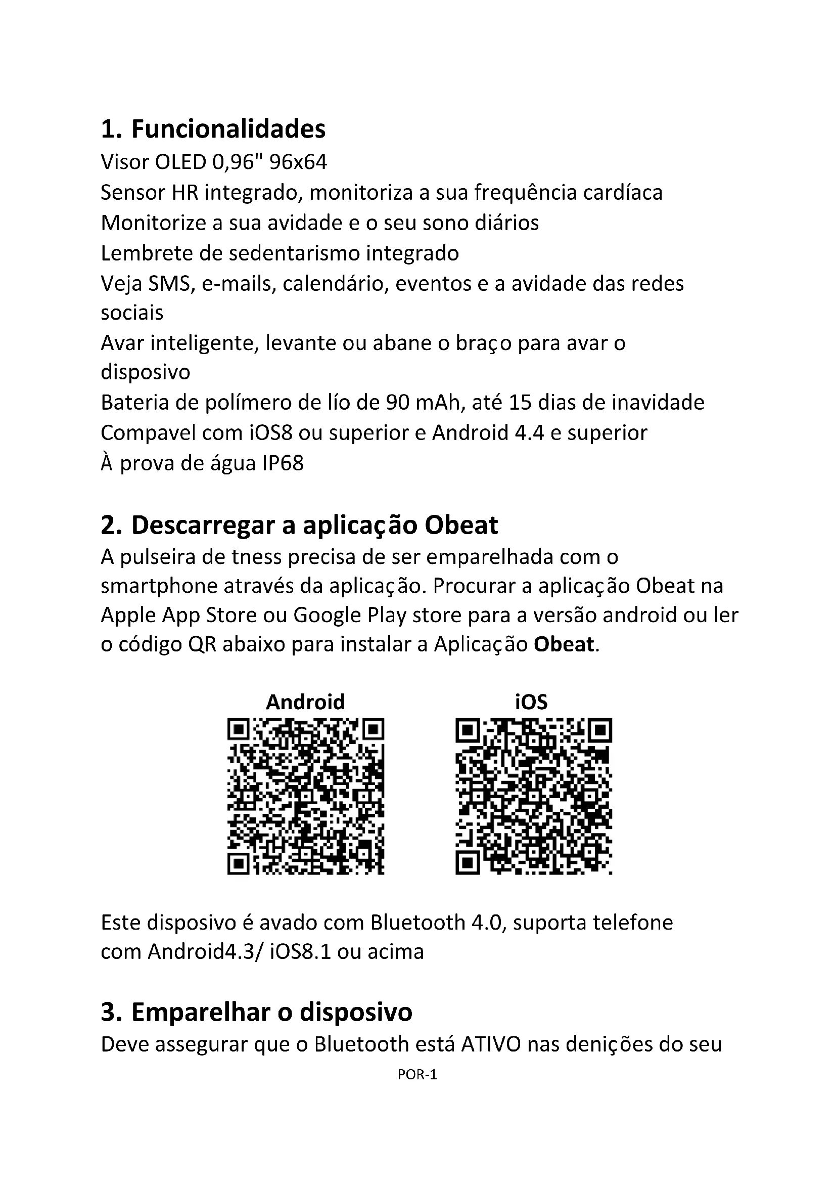 A pulseira de fitness precisa de ser emparelhada com o smartphone através da aplicação. Procurar a aplicação Obeat na Apple App Store ou Google Play store para a versão android ou ler o código QR abaixo para instalar a Aplicação Obeat. Android iOS
