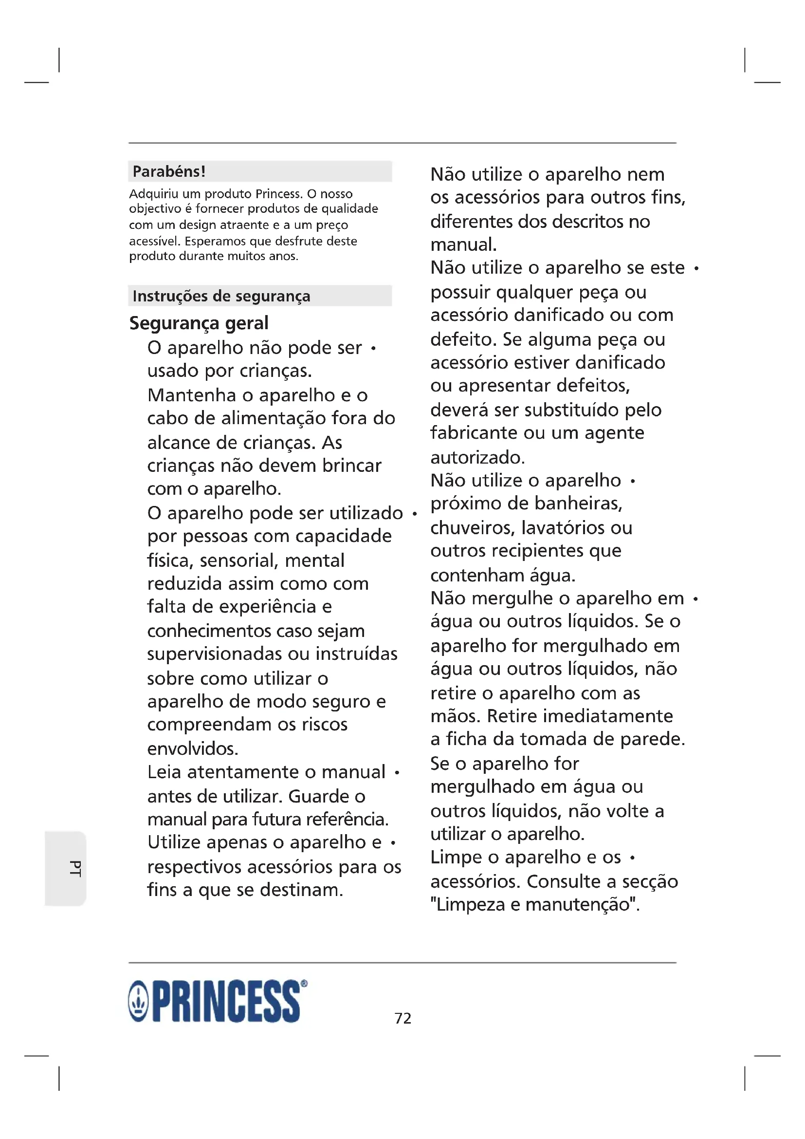 Parabéns! Adquiriu um produto Princess. O nosso objectivo é fornecer produtos de qualidade com um design atraente e a um preço acessível. Esperamos que desfrute deste produto durante muitos anos. Instruções de segurança Segurança geral O aparelho não pode ser • usado por crianças. Mantenha o aparelho e o cabo de alimentação fora do alcance de crianças. As crianças não devem brincar com o aparelho. O aparelho pode ser utilizado • por pessoas com capacidade física, sensorial, mental reduzida assim como com falta de experiência e conhecimentos caso sejam supervisionadas ou instruídas sobre como utilizar o aparelho de modo seguro e compreendam os riscos envolvidos. Leia atentamente o manual • antes de utilizar. Guarde o manual para futura referência. Utilize apenas o aparelho e • respectivos acessórios para os fins a que se destinam. Não utilize o aparelho nem os acessórios para outros fins, diferentes dos descritos no manual. Não utilize o aparelho se este • possuir qualquer peça ou acessório danificado ou com defeito. Se alguma peça ou acessório estiver danificado ou apresentar defeitos, deverá ser substituído pelo fabricante ou um agente autorizado. Não utilize o aparelho • próximo de banheiras, chuveiros, lavatórios ou outros recipientes que contenham água. Não mergulhe o aparelho em • água ou outros líquidos. Se o aparelho for mergulhado em água ou outros líquidos, não retire o aparelho com as mãos. Retire imediatamente a ficha da tomada de parede. Se o aparelho for mergulhado em água ou outros líquidos, não volte a utilizar o aparelho. Limpe o aparelho e os • acessórios. Consulte a secção "Limpeza e manutenção".73