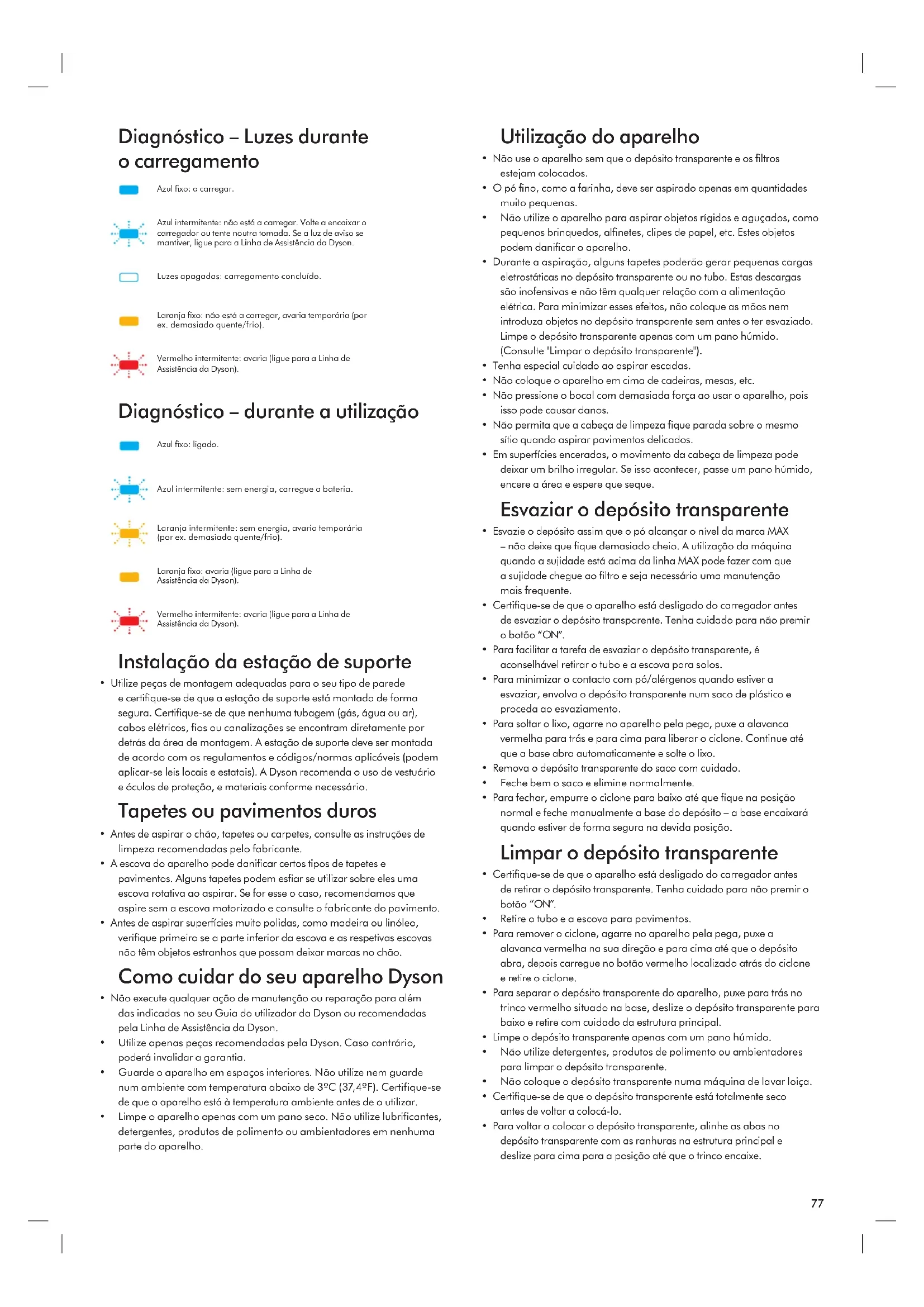 - Para voltar a colocar o depósito transparente, alinhe as abas no depósito transparente com as ranhuras na estrutura principal e deslize para cima para a posição até que o trinco encaixe. Azul fixo: a carregar. Azul intermitente: não está a carregar. Volte a encaixar o carregador ou tente noutra tomada. Se a luz de aviso se mantiver, ligue para a Linha de Assistência da Dyson. Luzes apagadas: carregamento concluído. Laranja fixo: não está a carregar, avaria temporária (por ex. demasiado quente/frio). Vermelho intermitente: avaria (ligue para a Linha de Assistência da Dyson). Azul fixo: ligado. Azul intermitente: sem energia, carregue a bateria. Laranja intermitente: sem energia, avaria temporária (por ex. demasiado quente/frio). Laranja fixo: avaria (ligue para a Linha de Assistência da Dyson). Vermelho intermitente: avaria (ligue para a Linha de Assistência da Dyson).78