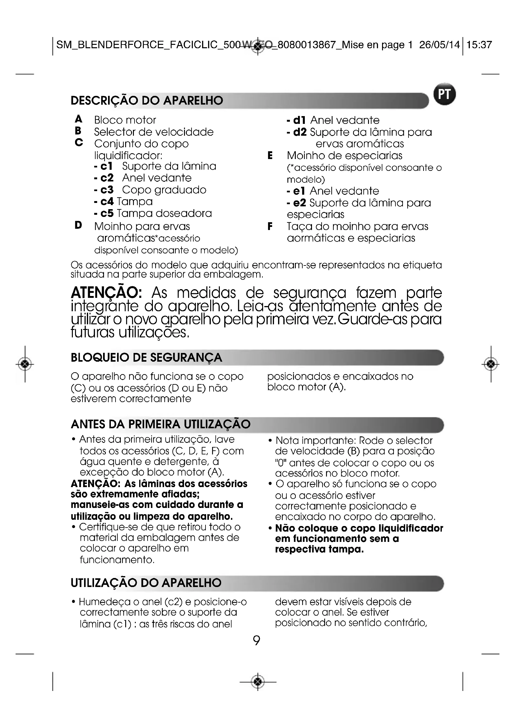 - d1 Anel vedante - d2 Suporte da lâmina para ervas aromáticas Moinho de especiarias (*acessório disponível consoante omodelo) - e1 Anel vedante - e2 Suporte da lâmina para especiarias Taça do moinho para ervas aormáticas e especiarias Os acessórios do modelo que adquiriu encontram-se representados na etiqueta situada na parte superior da embalagem. ATENÇÃO: As medidas de segurança fazem parte integrante do aparelho. Leia-as atentamente antes de utilizar o novo aparelho pela primeira vez. Guarde-as para futuras utilizações.
