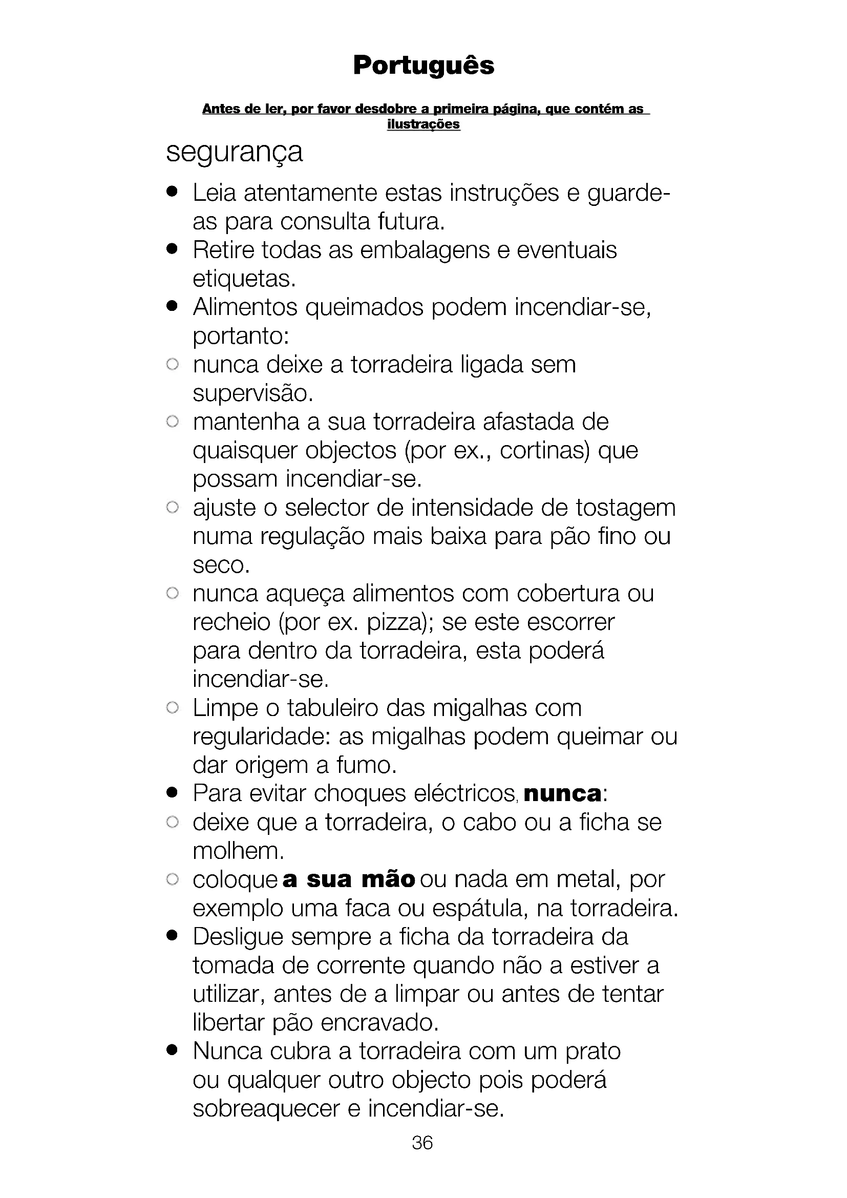 Nunca cubra a torradeira com um prato ou qualquer outro objecto pois poderá sobreaquecer e incendiar-se. Antes de ler, por favor desdobre a primeira página, que contém as ilustraçõesEnglish